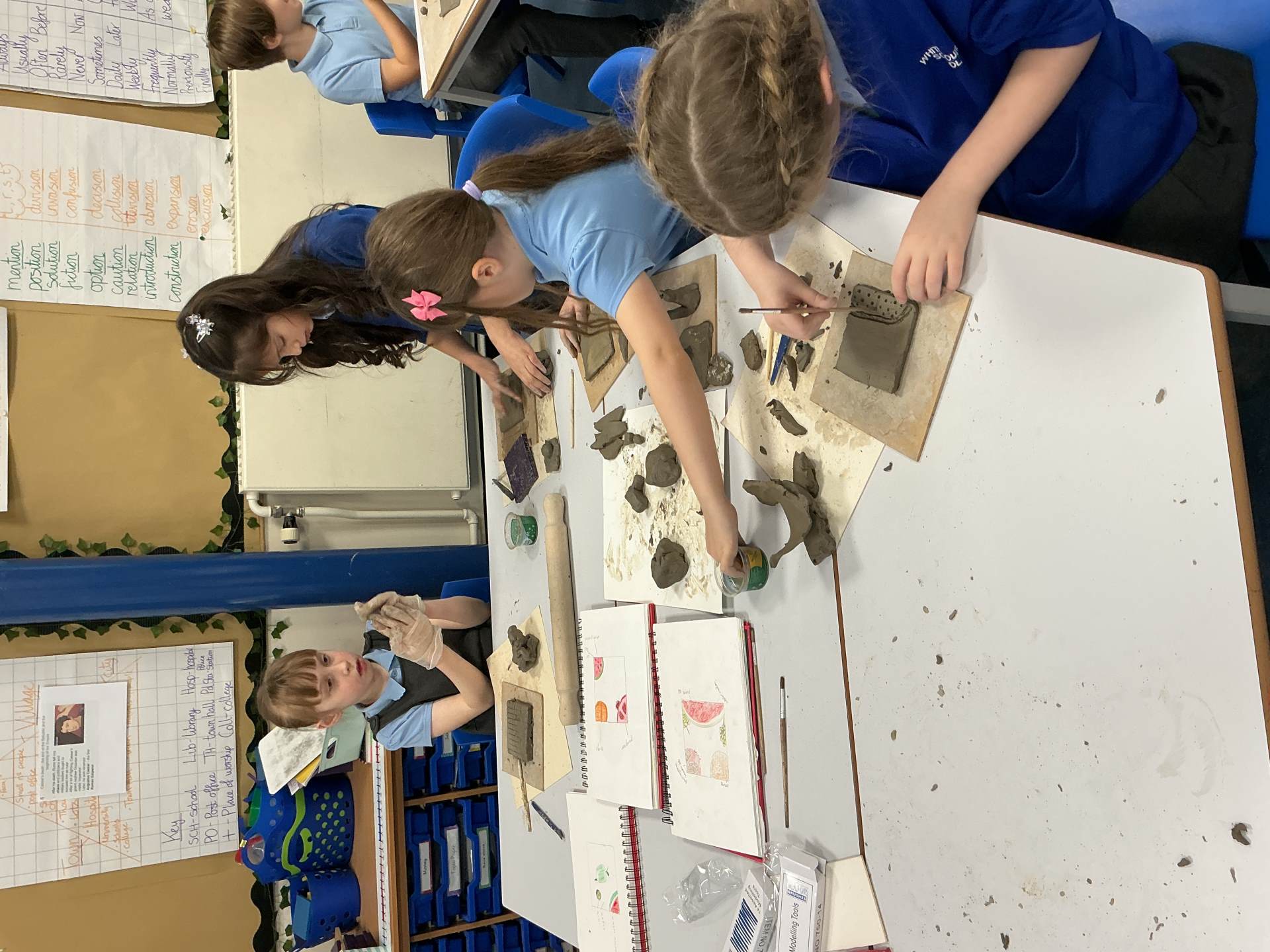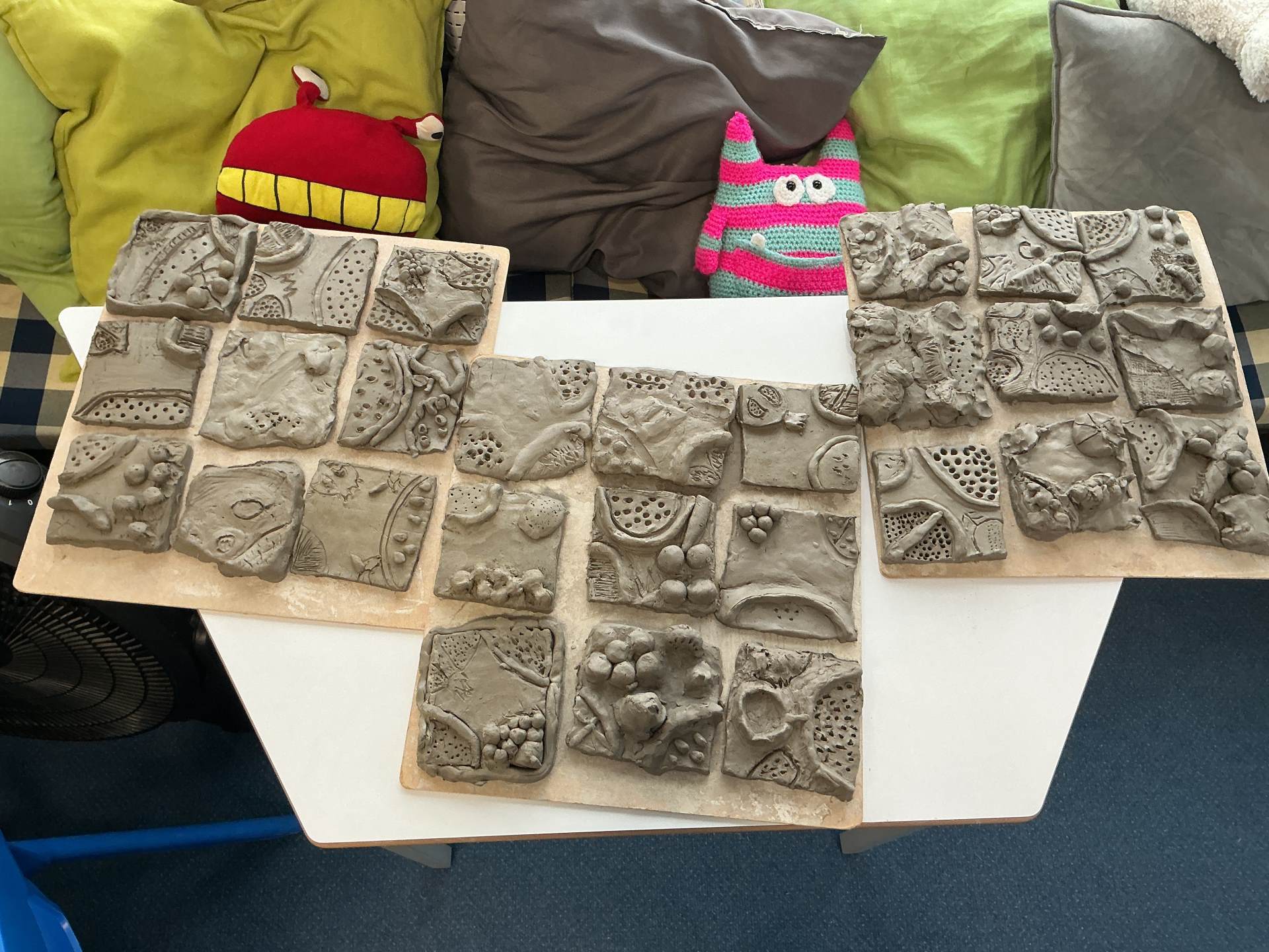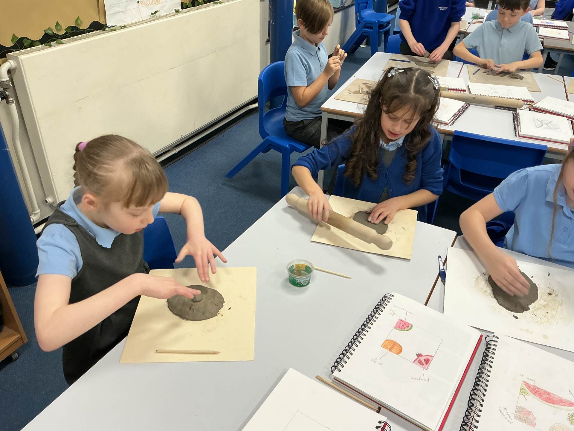Today in art, we made clay fruit tiles. We practised using etching, scoring, sticking and blending to make pieces of different fruits.