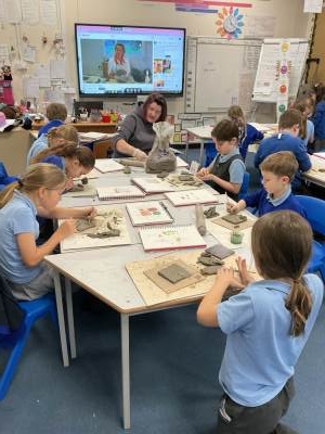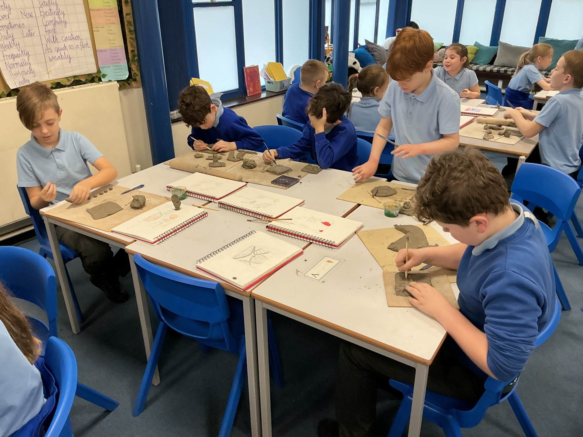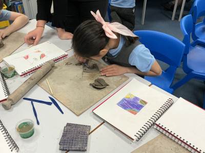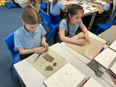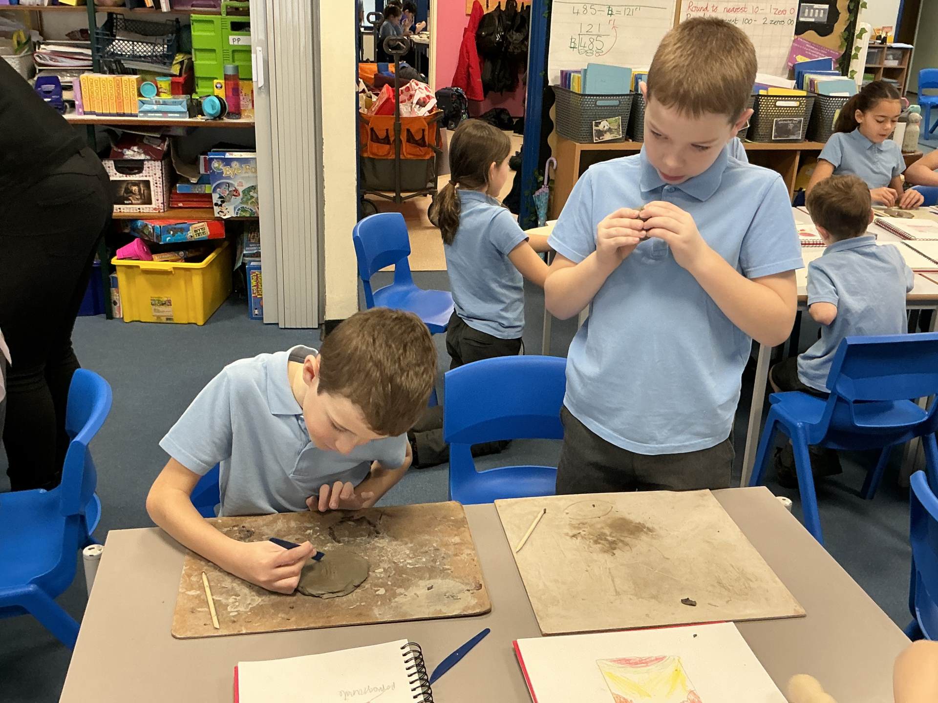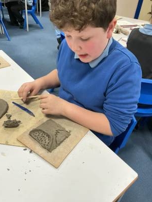 Today in art, we made clay fruit tiles. We practised using etching, scoring, sticking and blending to make pieces of different fruits.