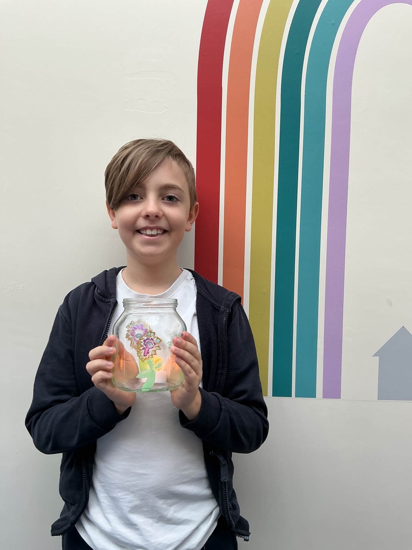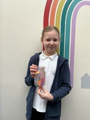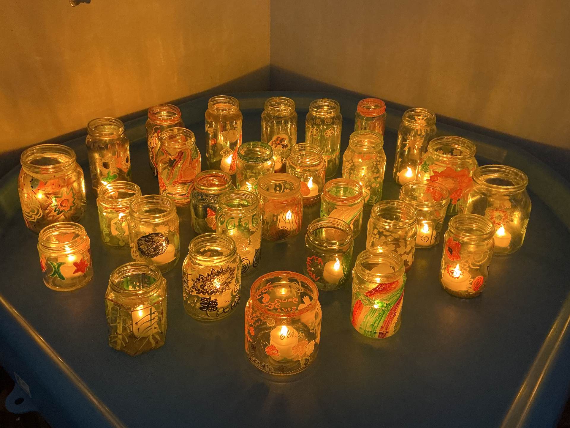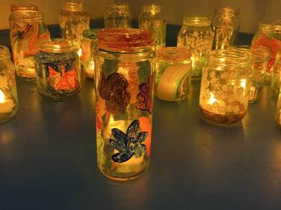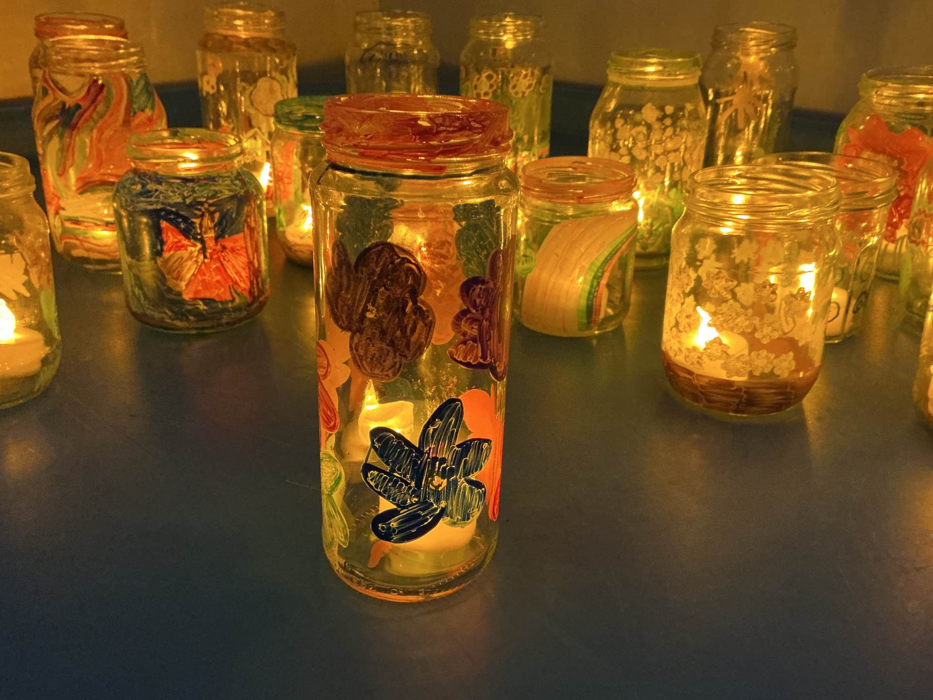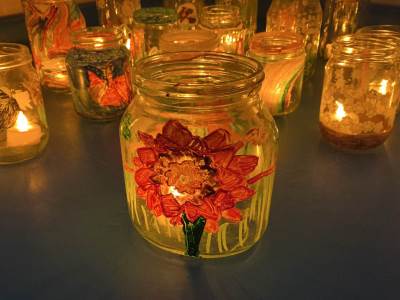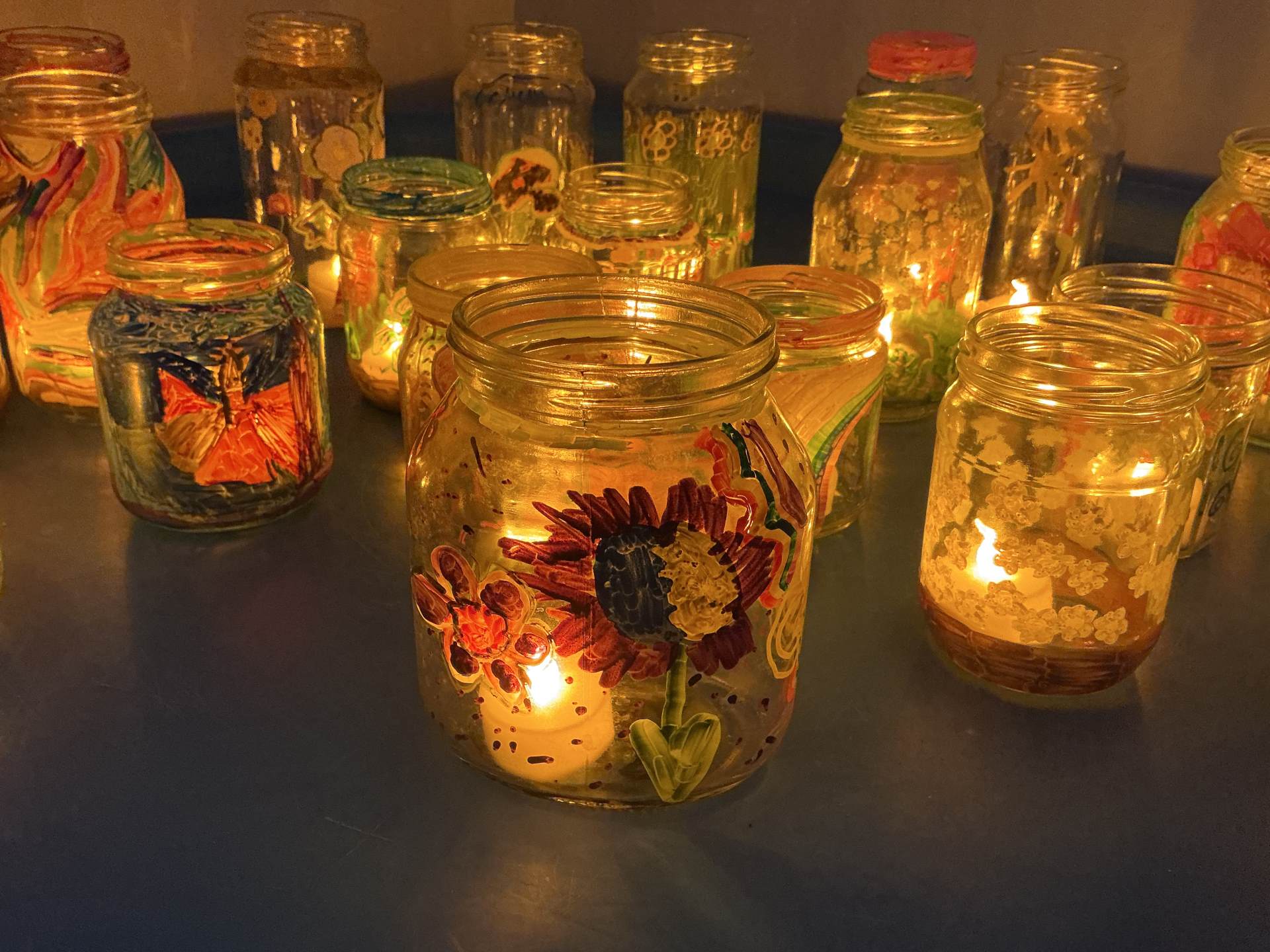 For our Take One Piece project this term, we looked at America glass artist Dale Chihuly. We decorated glass jars with flora and fauna using acrylic paint to recreate his style of work. We put candles inside the jars which was extremely effective and they looked beautiful.
