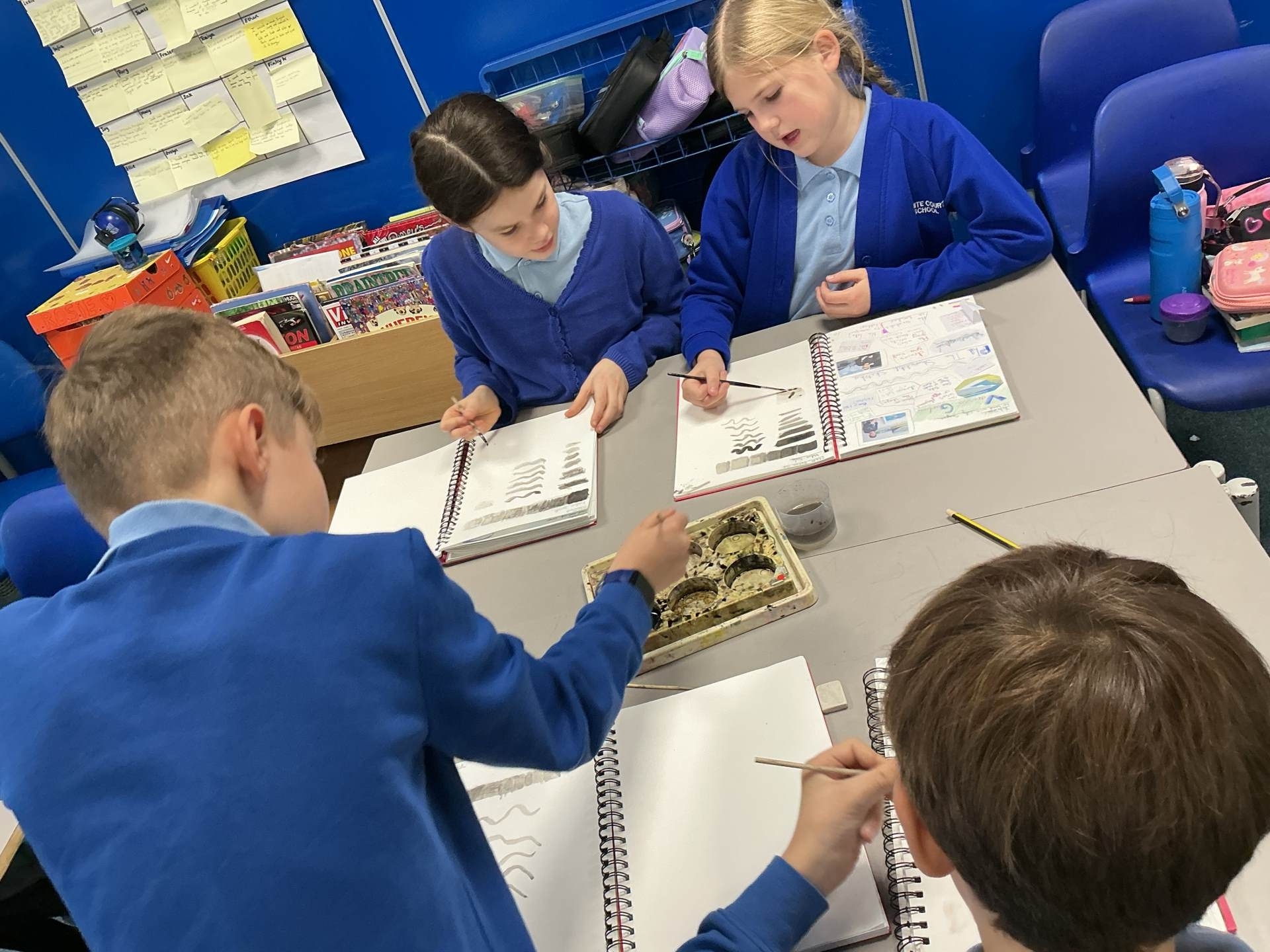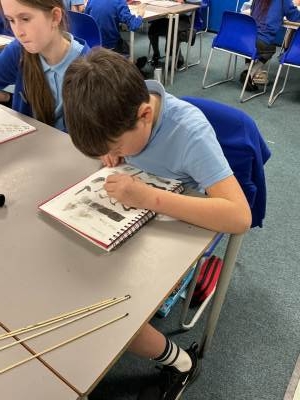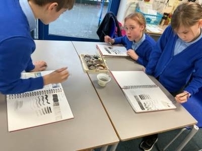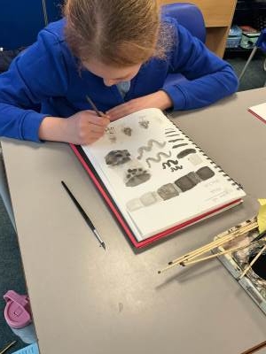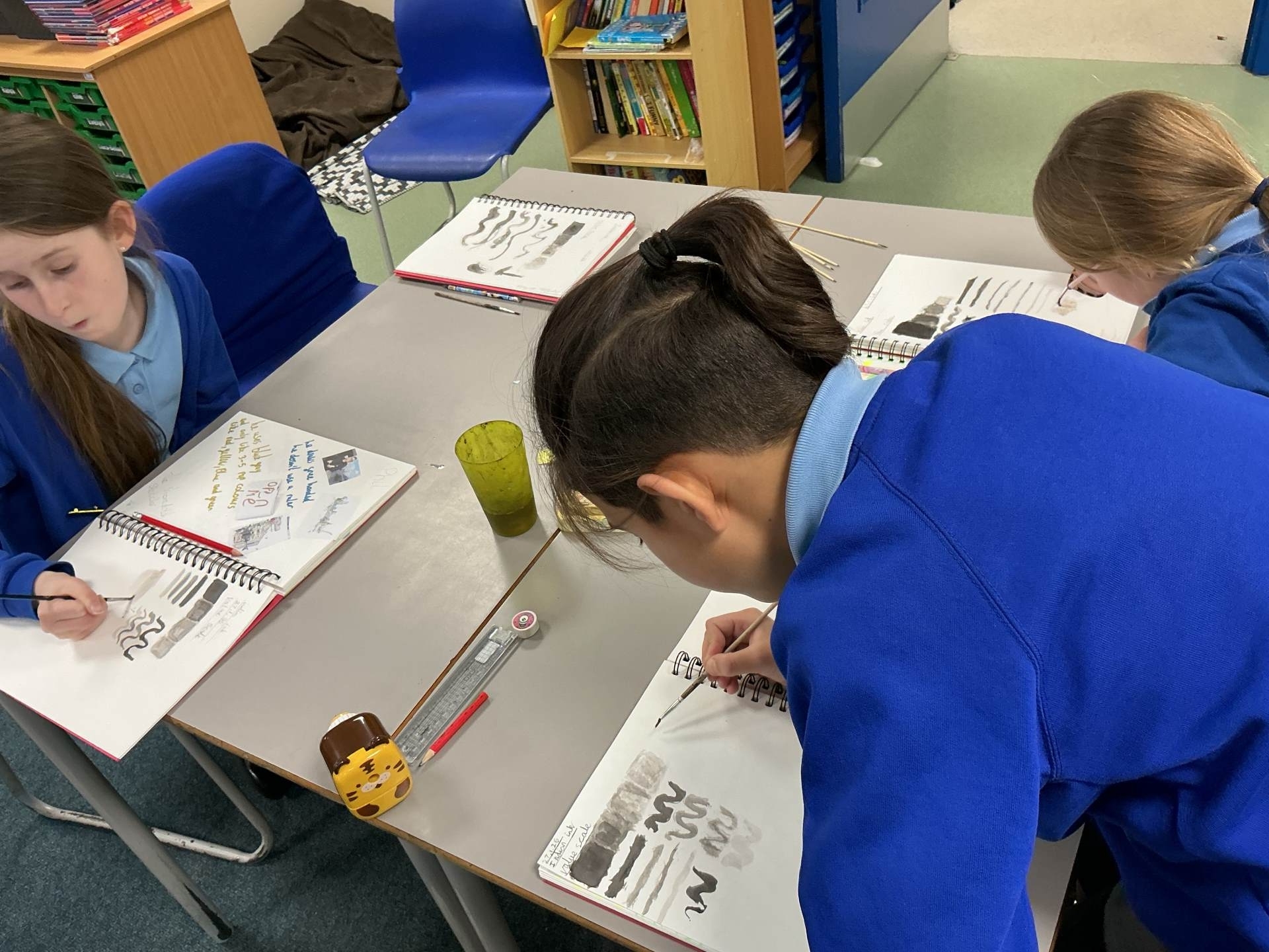 During our Art lesson this week, we learnt a range of techniques that can be created when working with Indian ink. Using a paintbrush and a wooden skewer, we were able to create colour values (shades of colour after adding varying amounts of water to the ink), colour washes (where the ink bled into the water wash) and differing line widths and patterns.