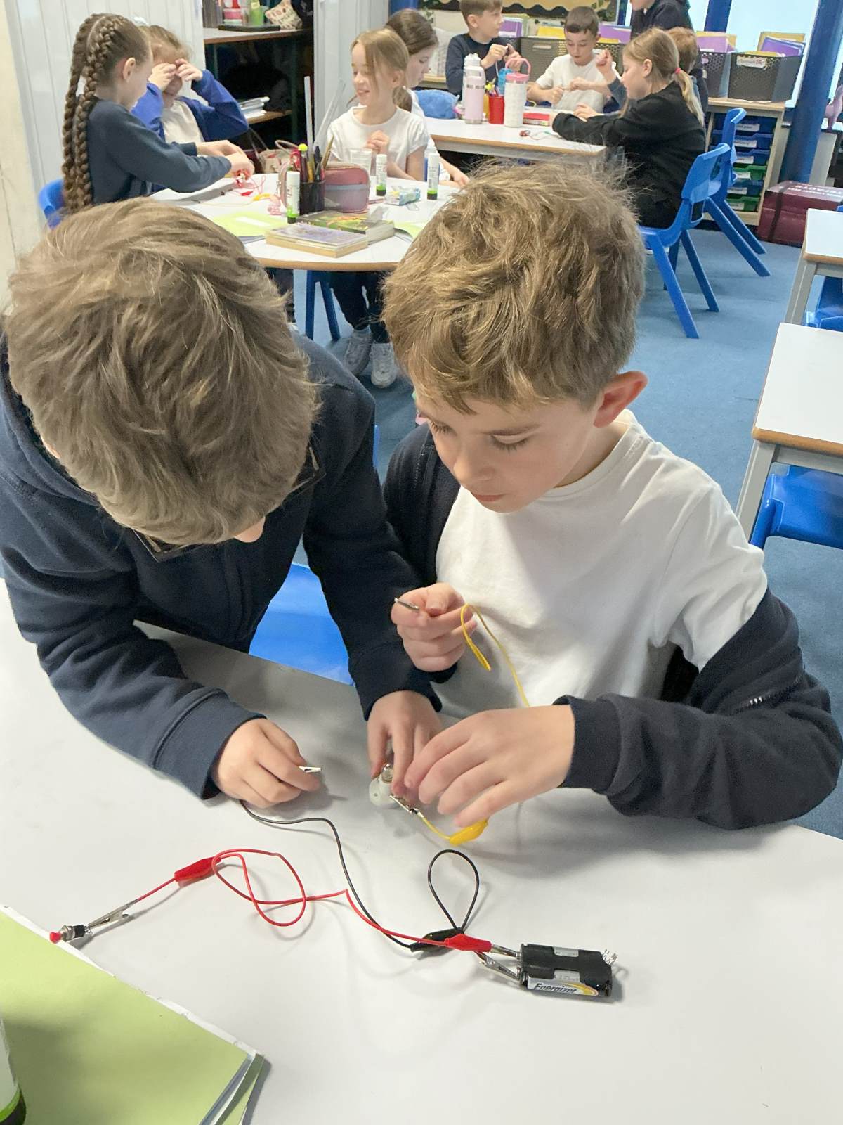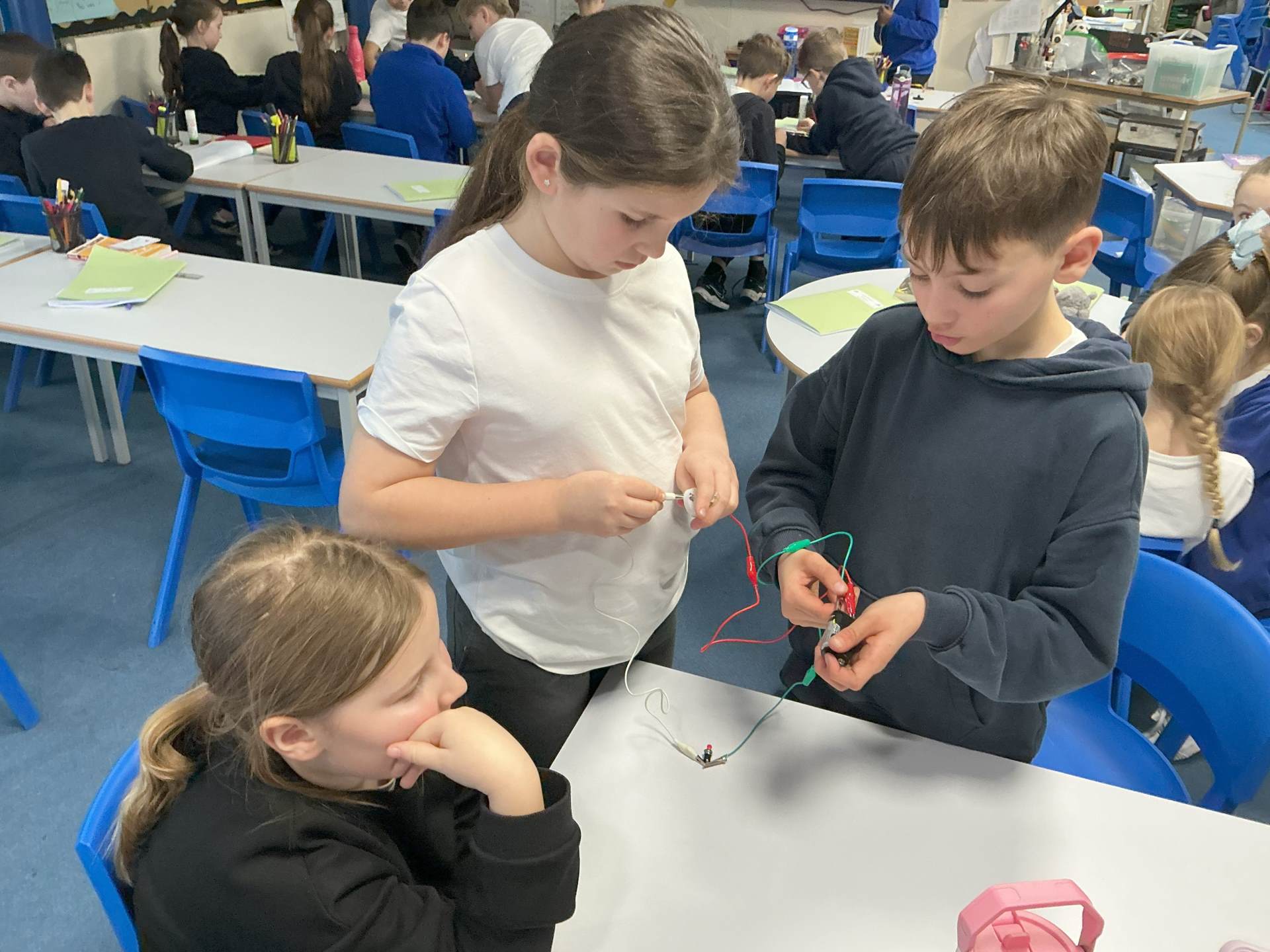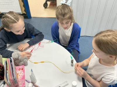 Today, we were excited about creating simple circuits and learning that a circuit is a pathway which electricity flows around and has to be unbroken to work. We learnt that a battery, bulb, switch and wires are all compenents. We added a switch to control the circuit.