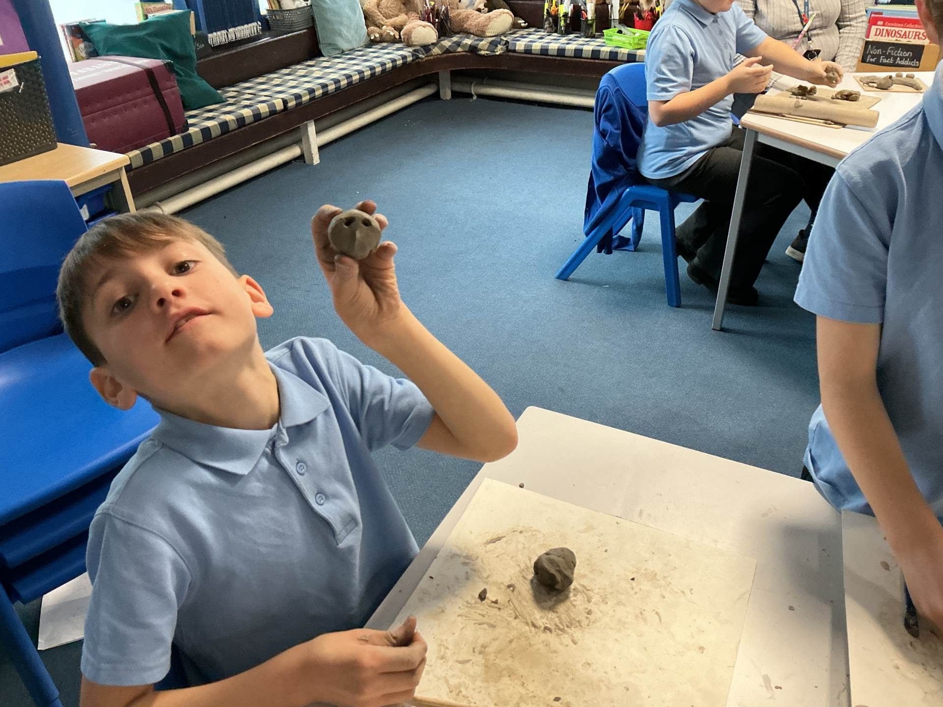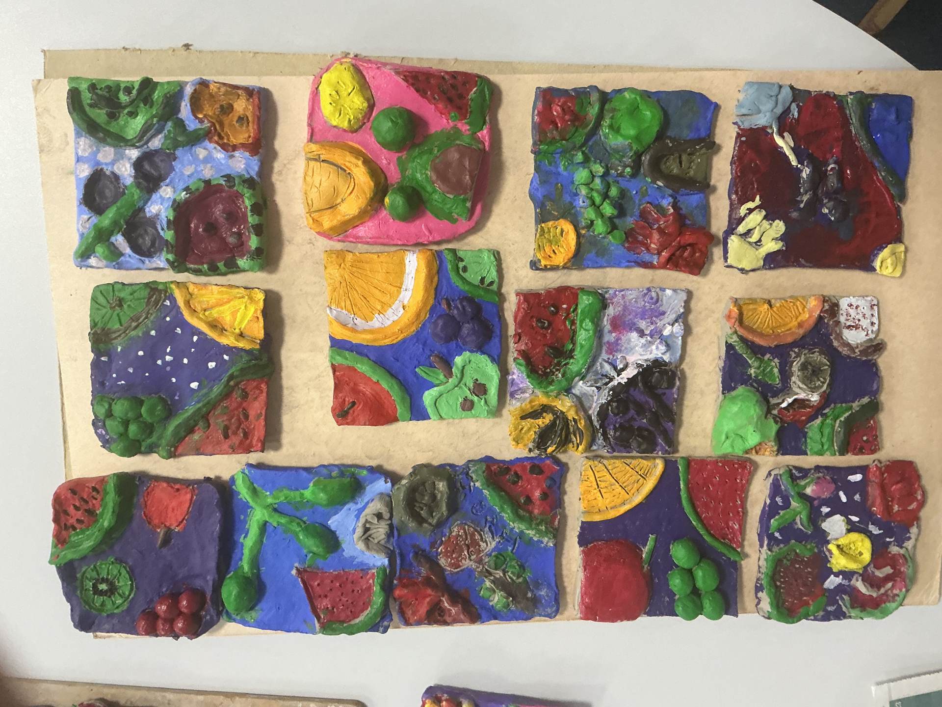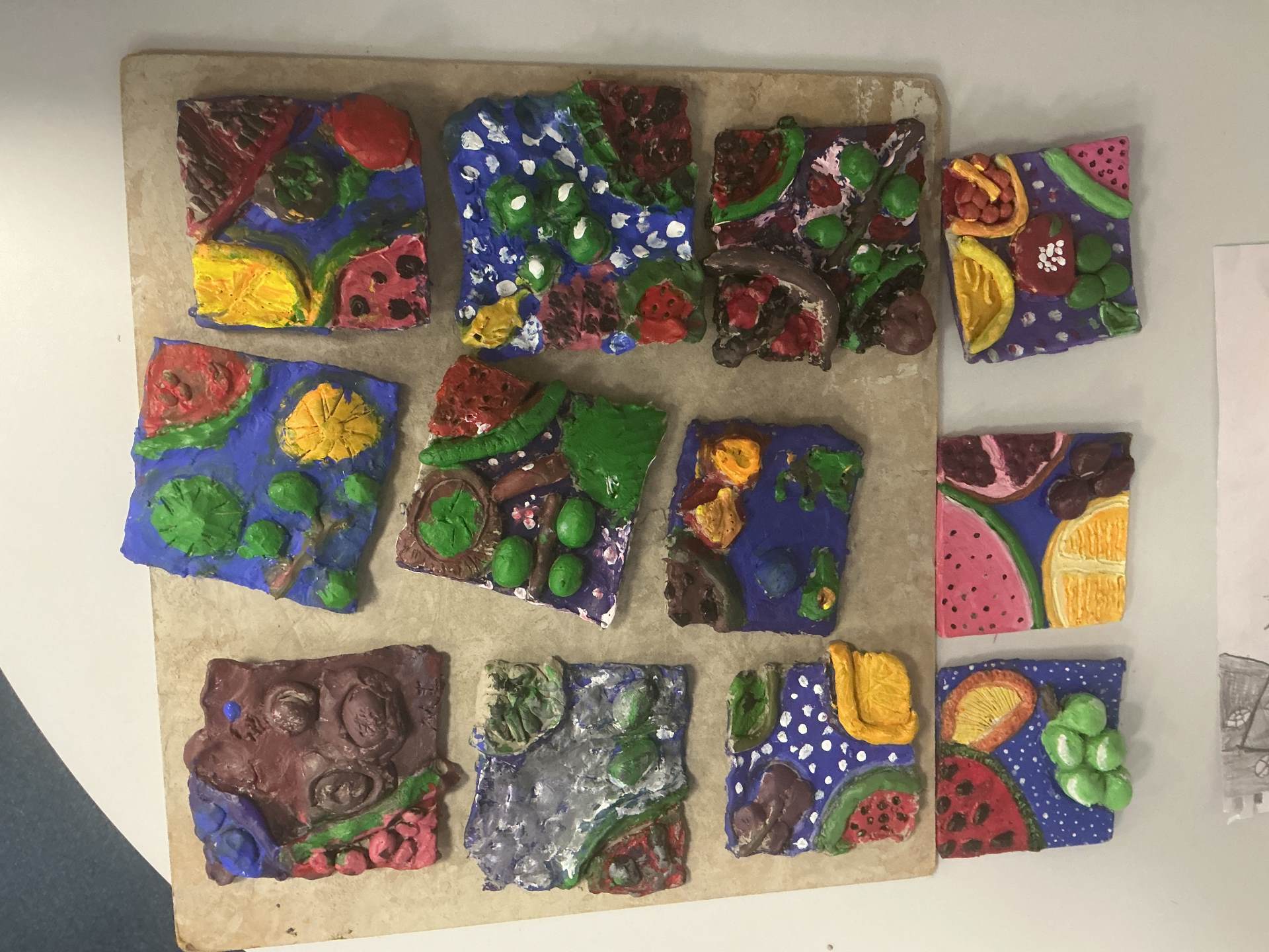 Today, we painted our Still Life Clay Tiles. They have yet to be glazed to create a sleek shine. Not only have we really enjoyed the process of making this art, we have learnt a lot about the use of shape, texture and colour.