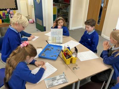 In Maths, we have been learning about money. We practised making ?1 in lots of different ways using coins.