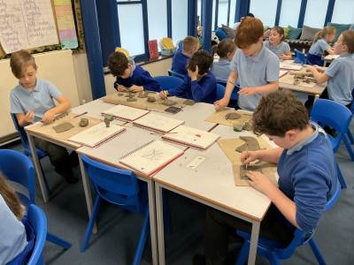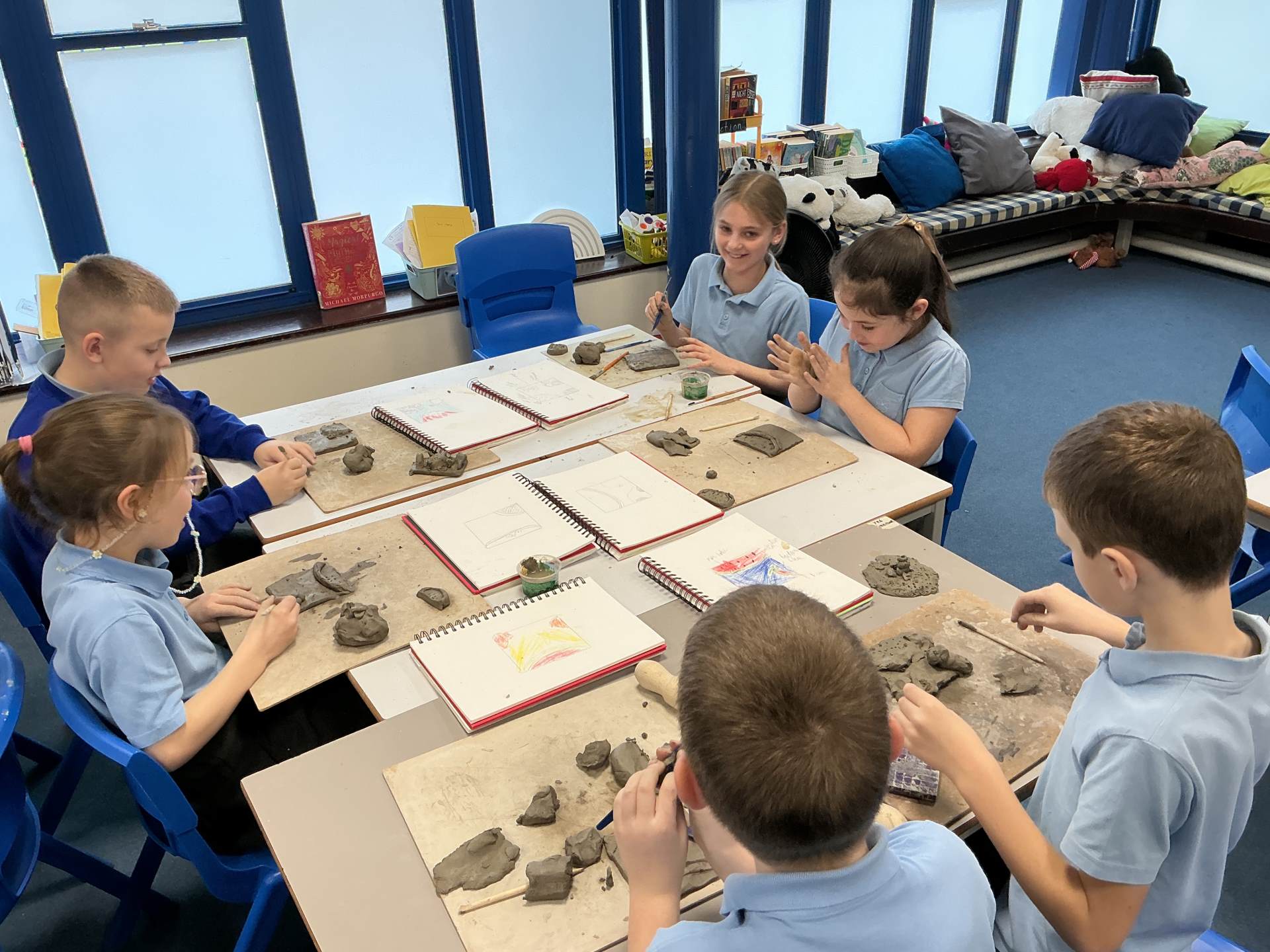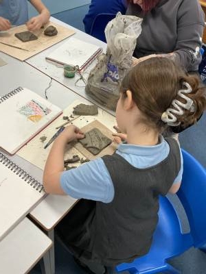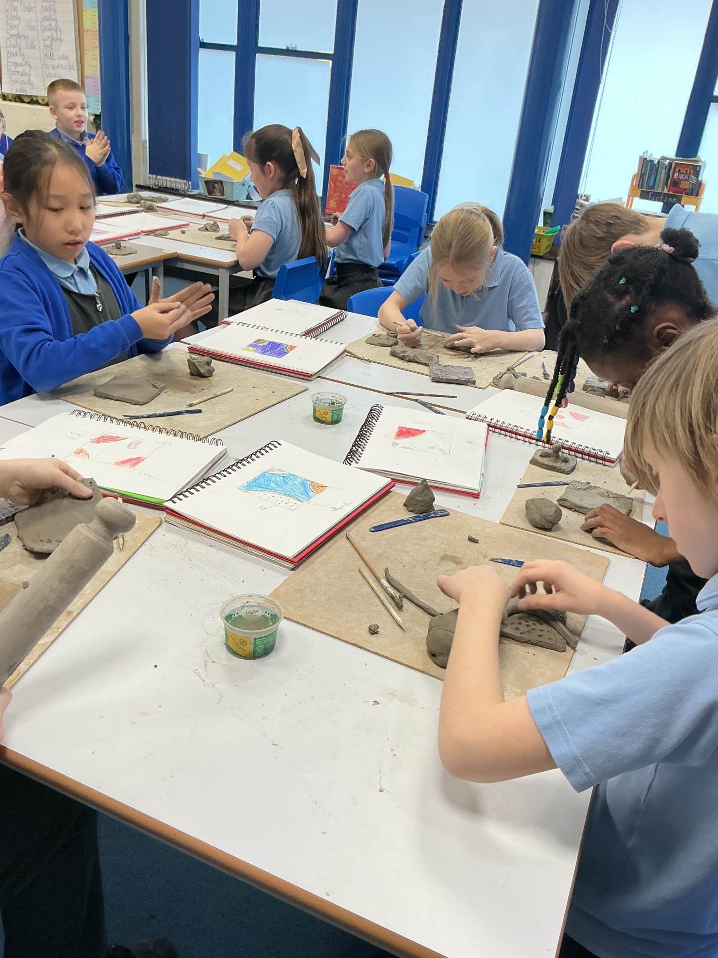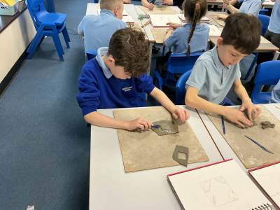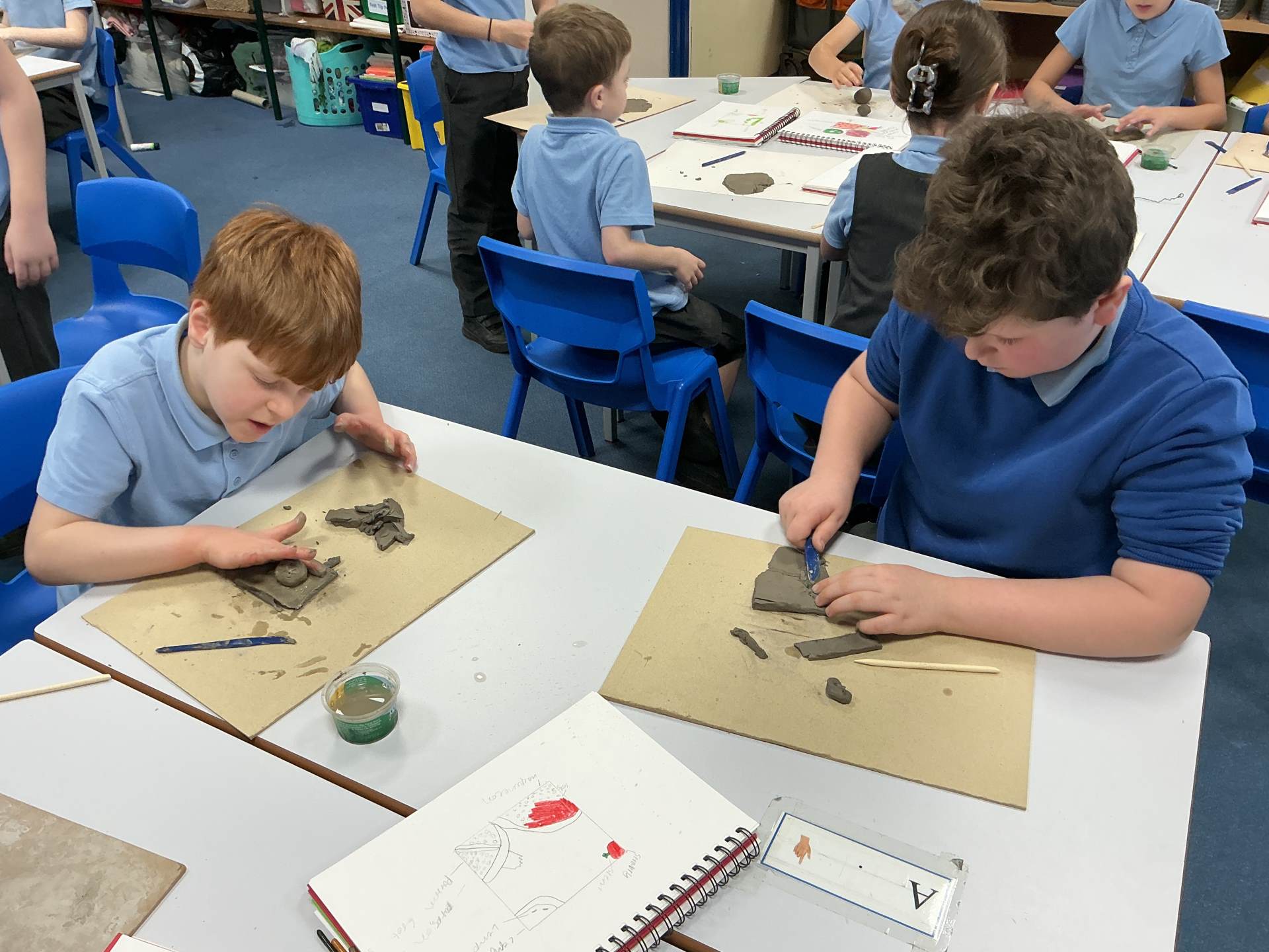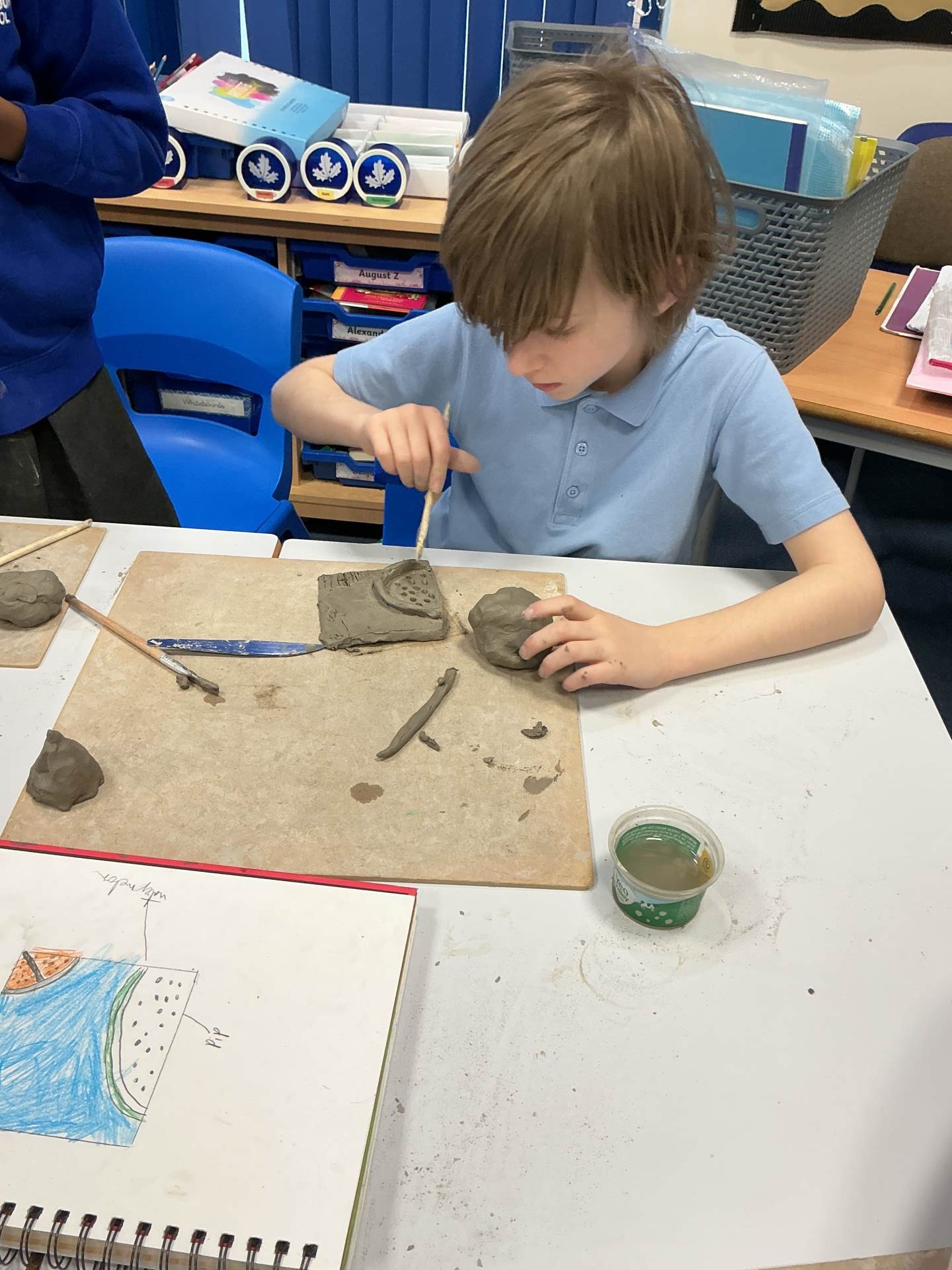 Today in art, we made clay fruit tiles. We practised using etching, scoring, sticking and blending to make pieces of different fruits.