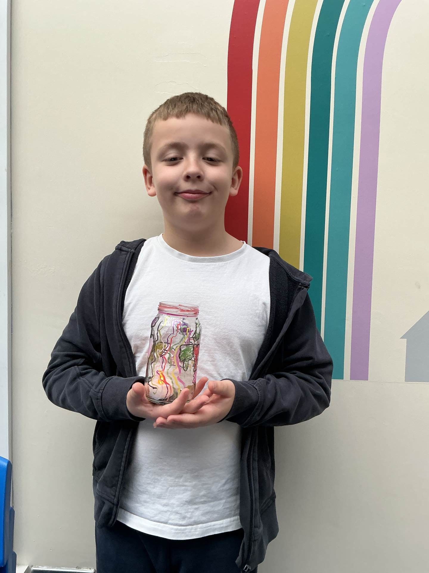 For our Take One Piece project this term, we looked at America glass artist Dale Chihuly. We decorated glass jars with flora and fauna using acrylic paint to recreate his style of work. We put candles inside the jars which was extremely effective and they looked beautiful.