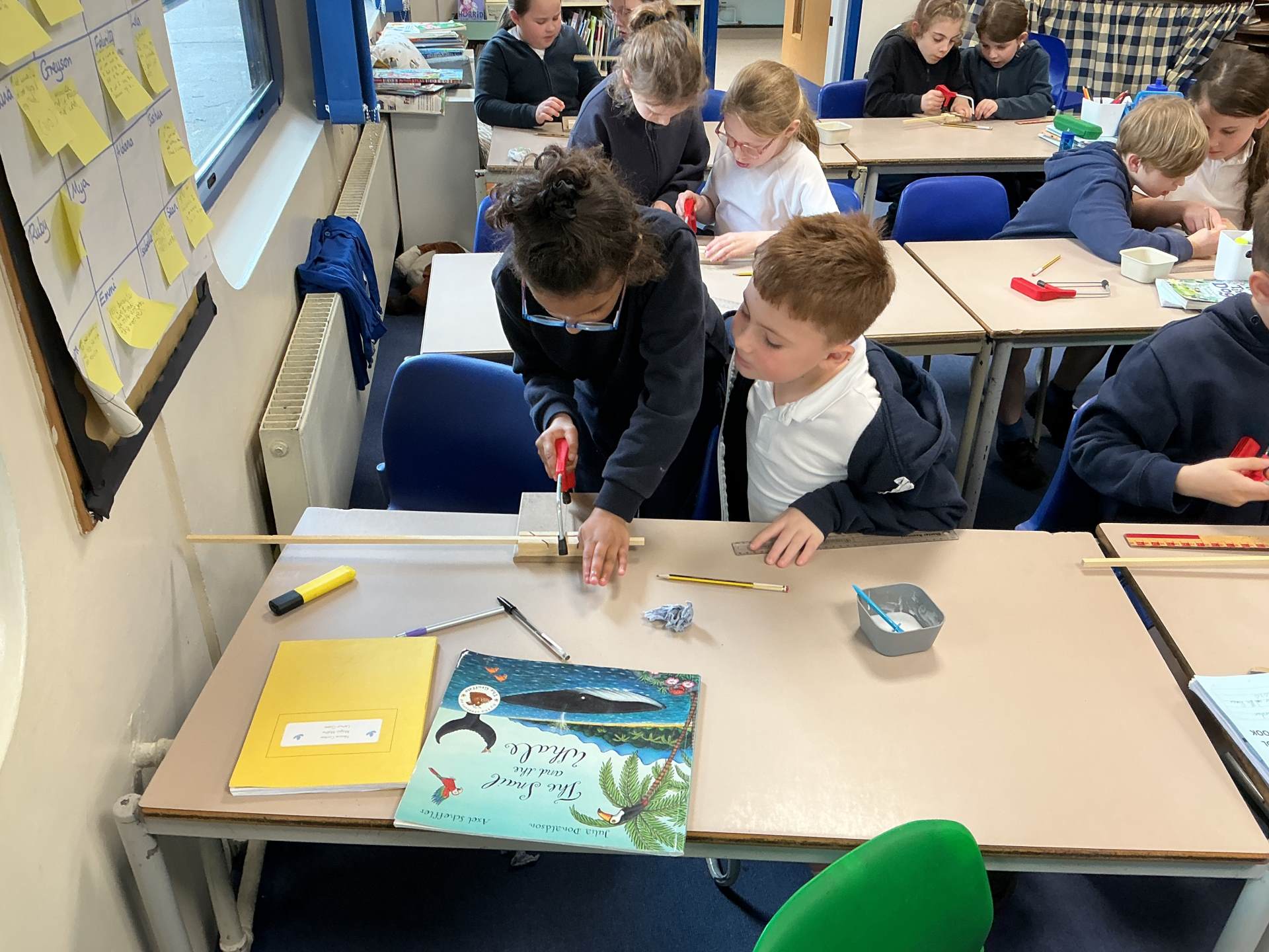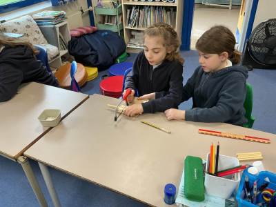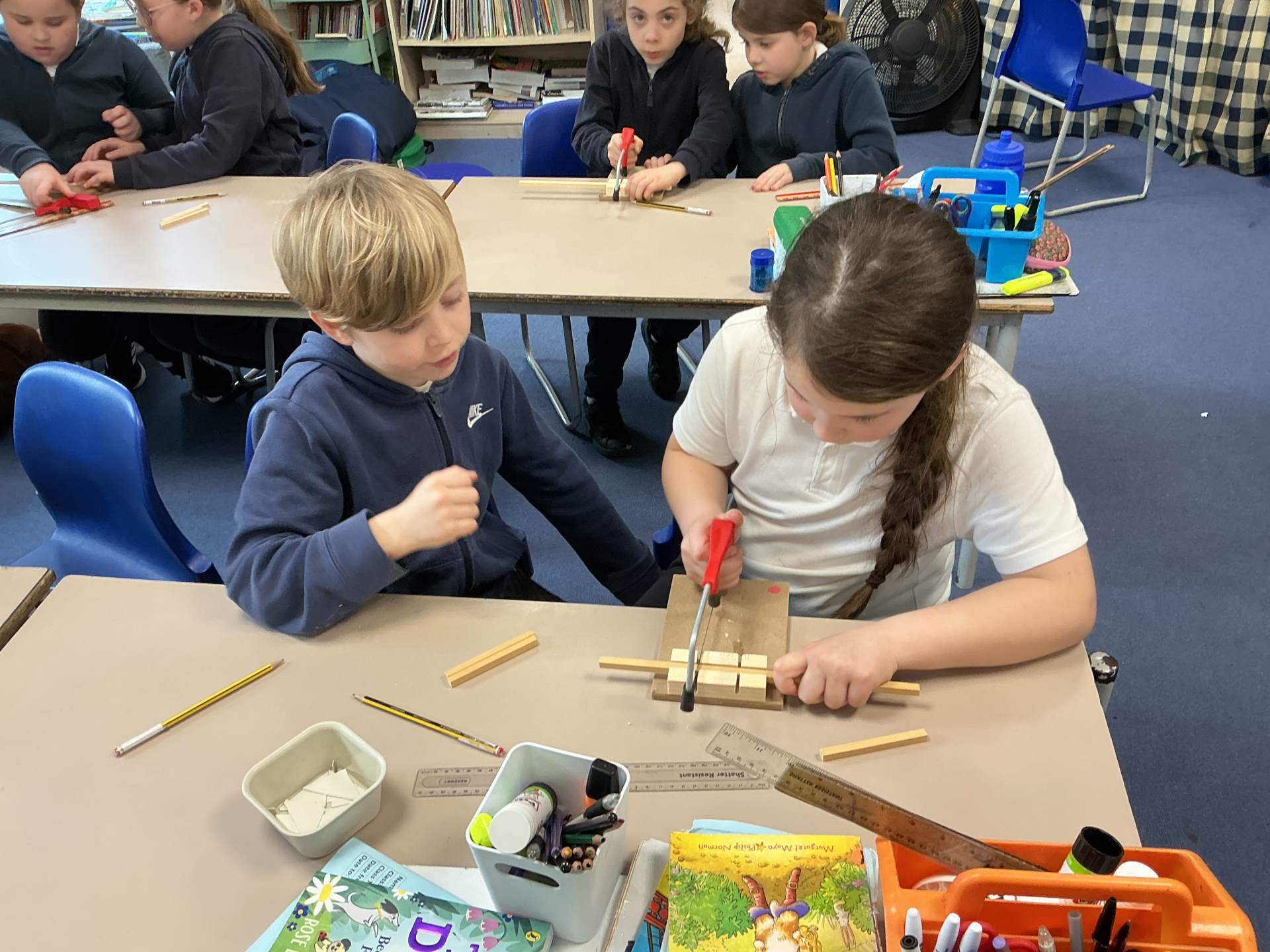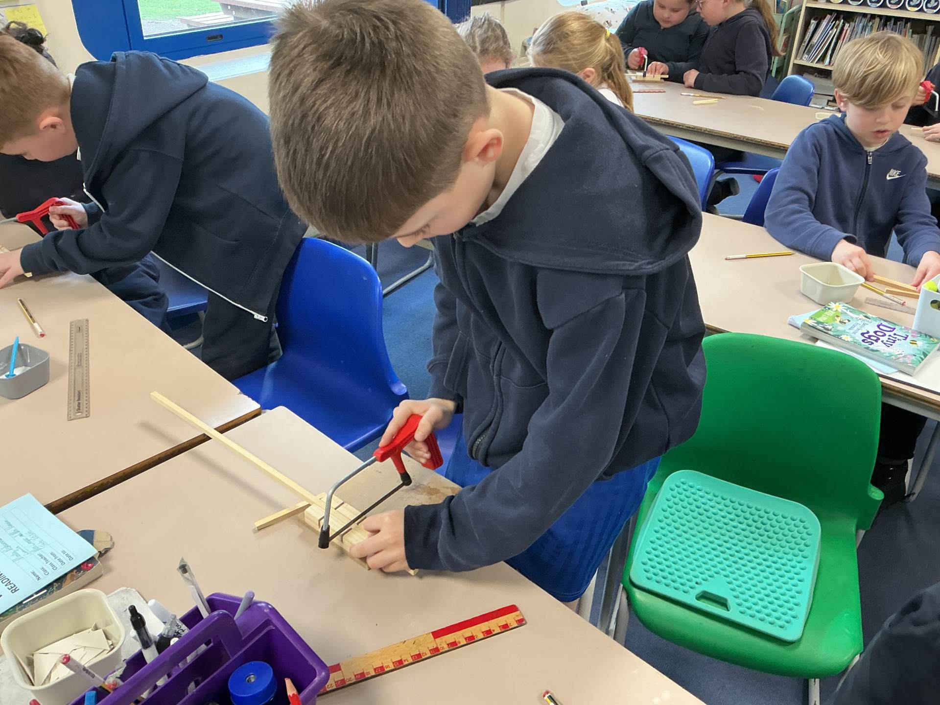 Today during our DT lesson we learned how to use saws and bench hooks. We measured our strips of wood accurately and then cut and glued a frame using cardboard corners for strength.