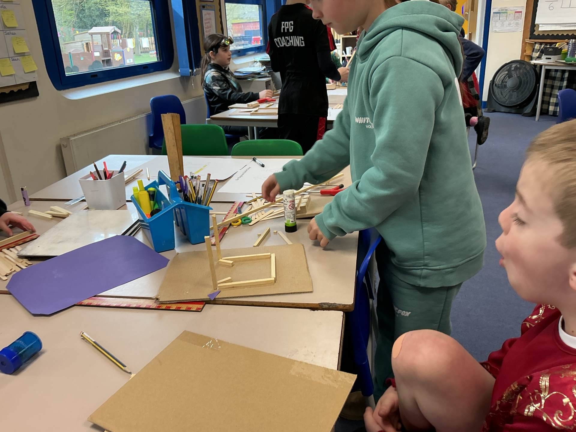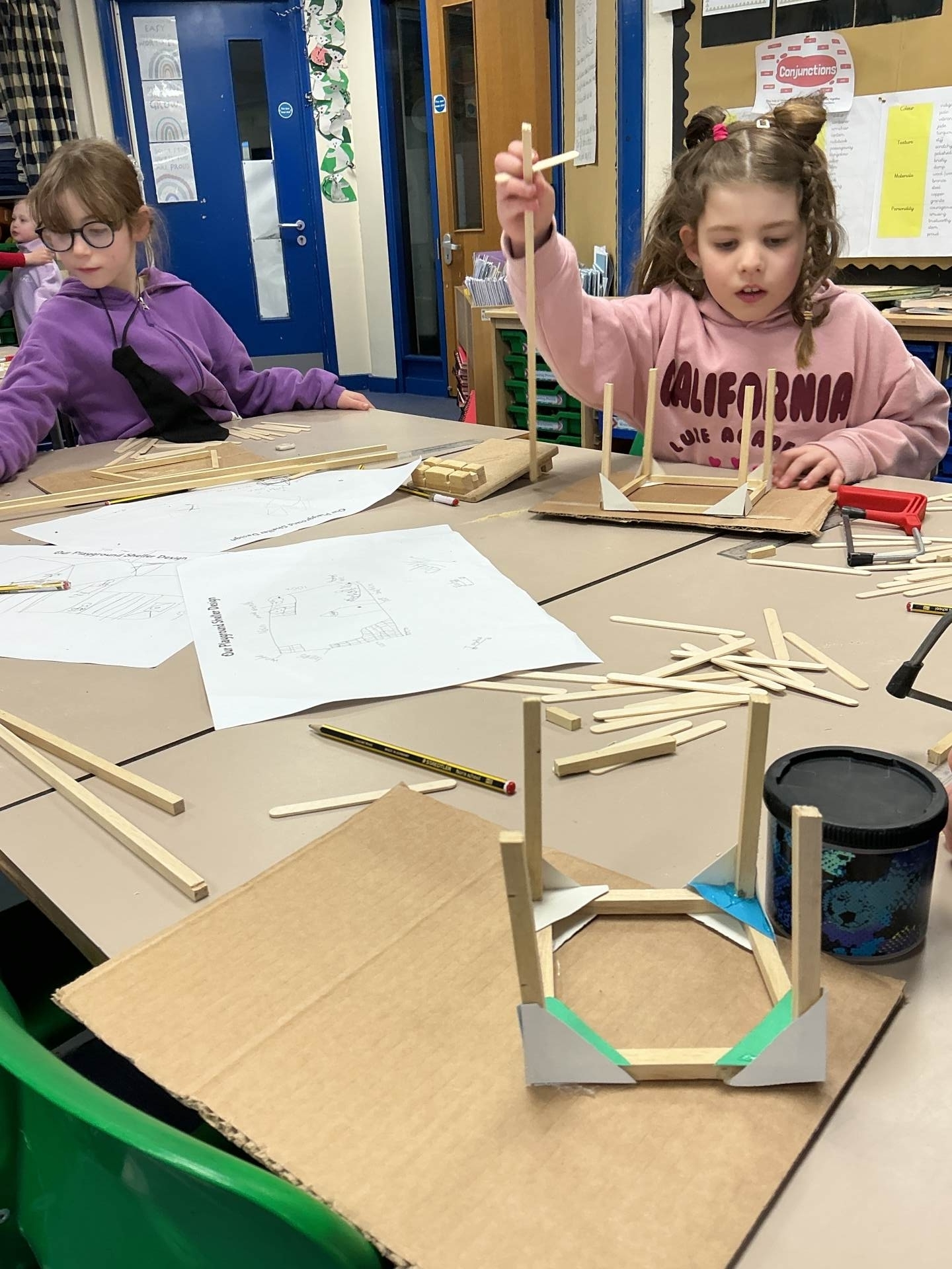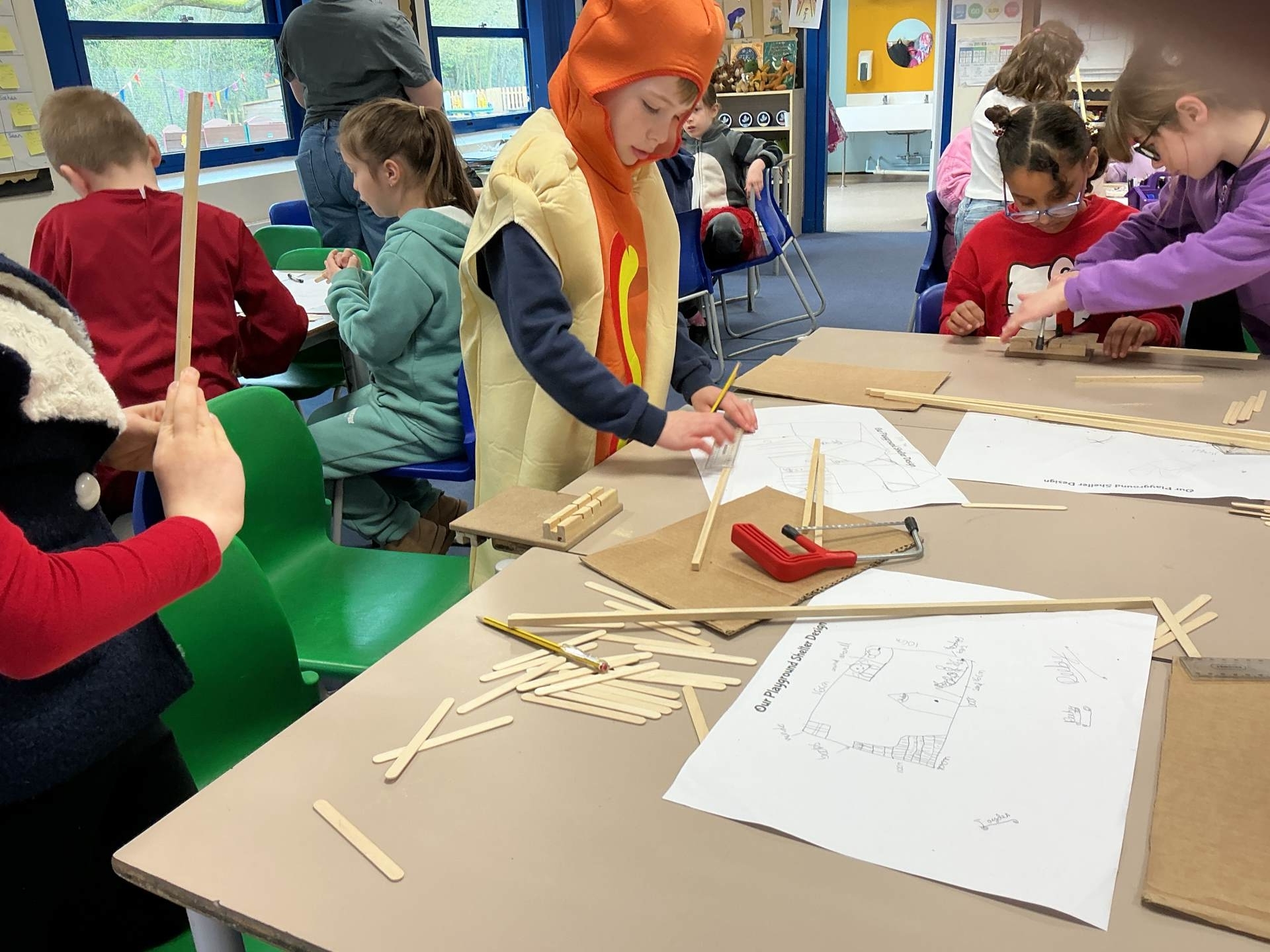 Today, we finally built our playground shelter models. We used saws and bench hooks to cut strips of wood.to create our final models. We then added various features to make them look individual.
