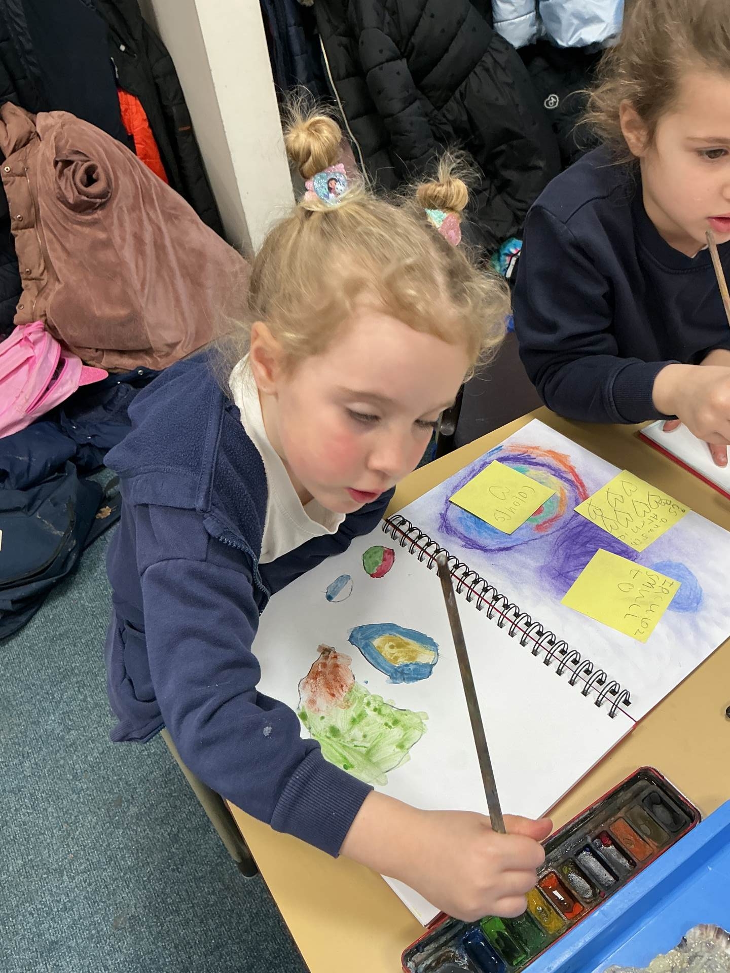 In table groups, we used either our hand or foot to print randomly across a large piece of paper using a different colour each. Next week we will be using them as our canvas for more Artwork!