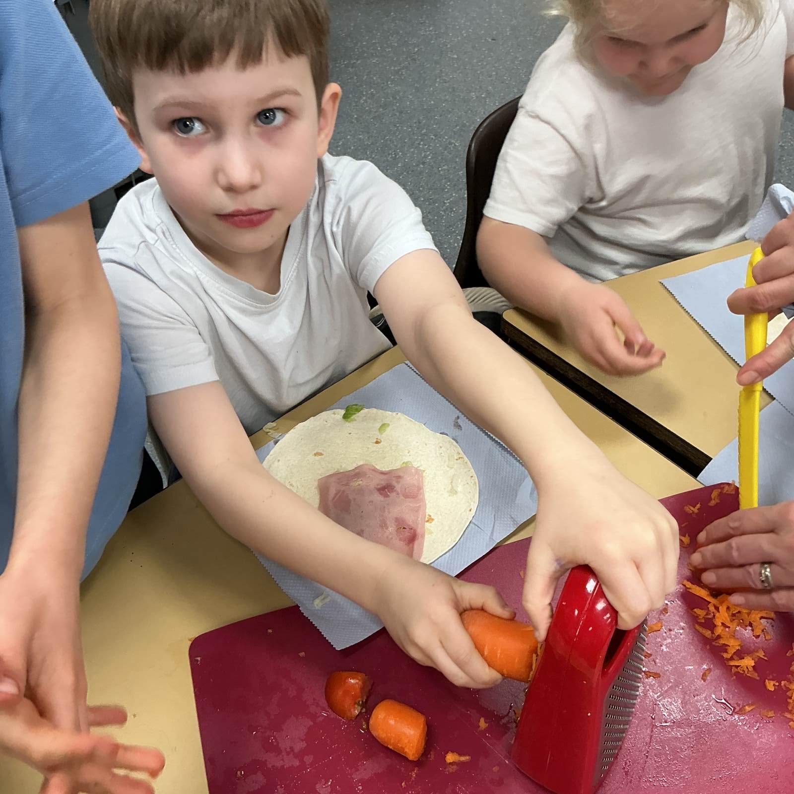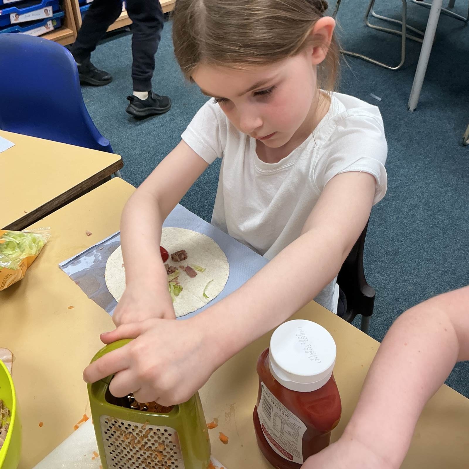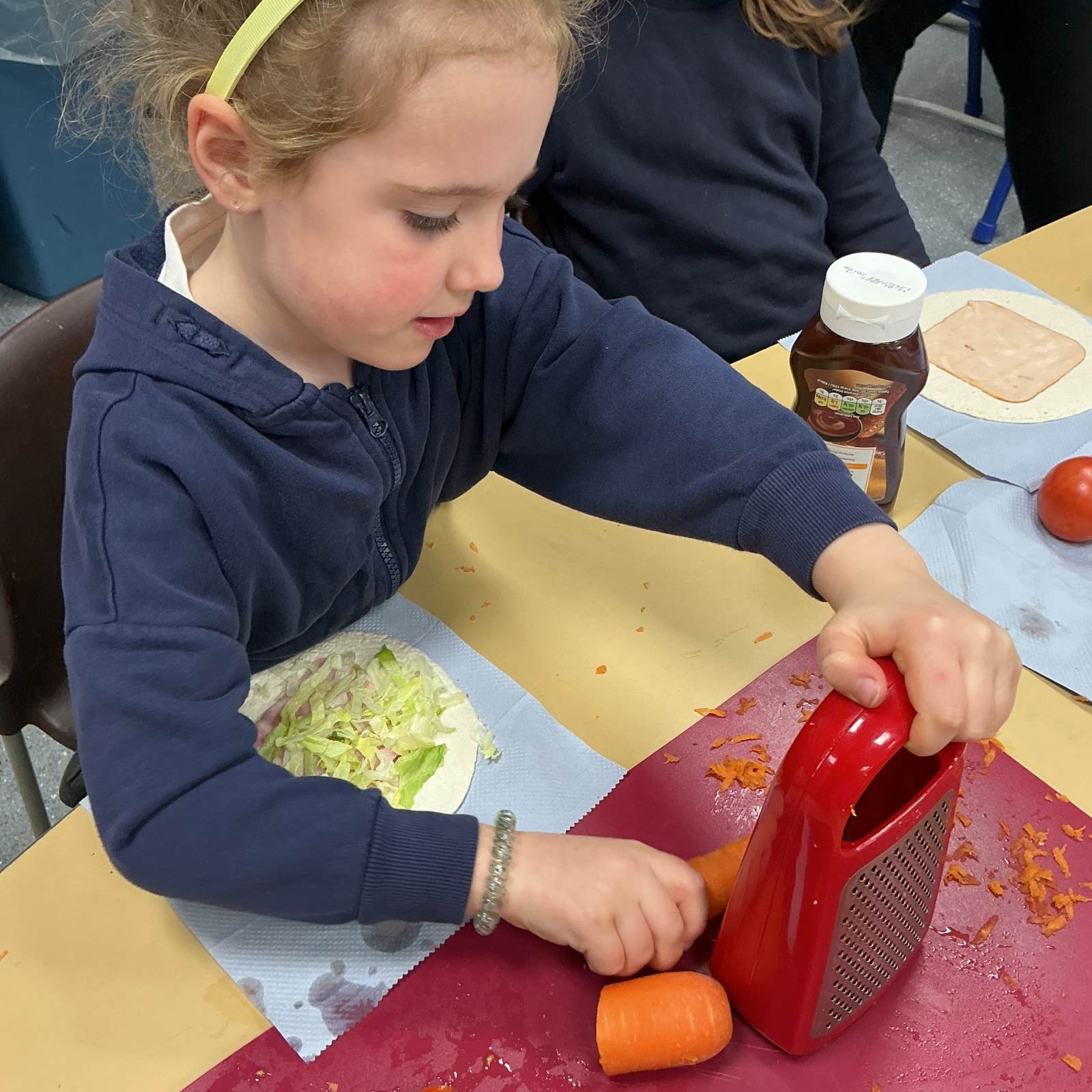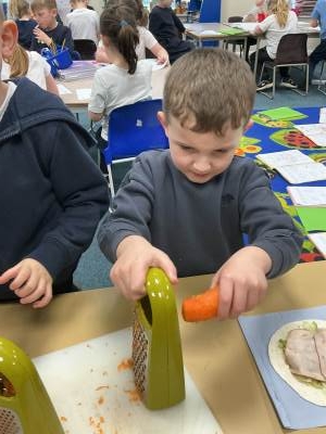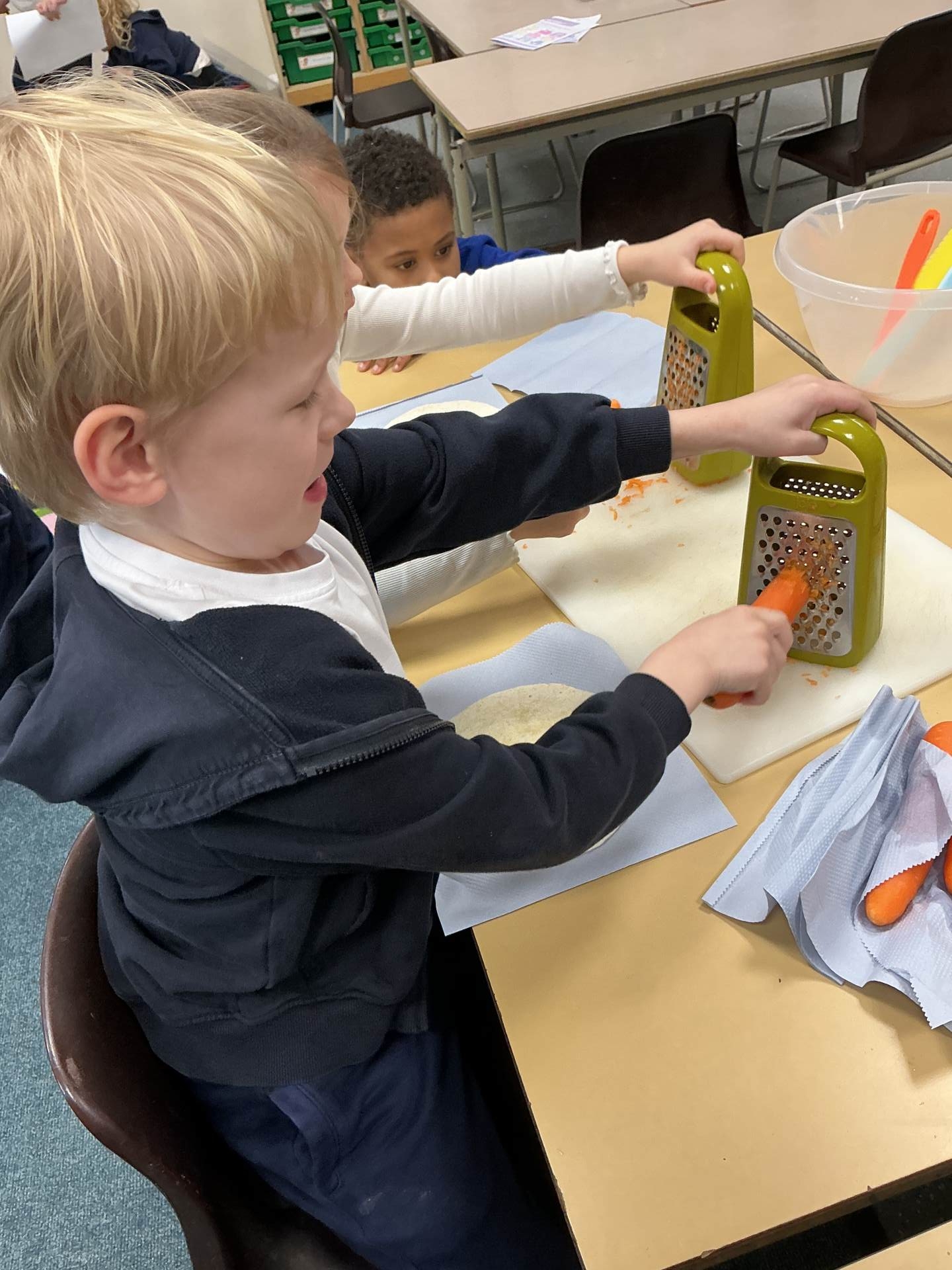 In DT we designed and made our portable snacks! We grated carrots and chopped tomatoes. We evaluated them by thinking about what we liked and what we would change if we made them again.