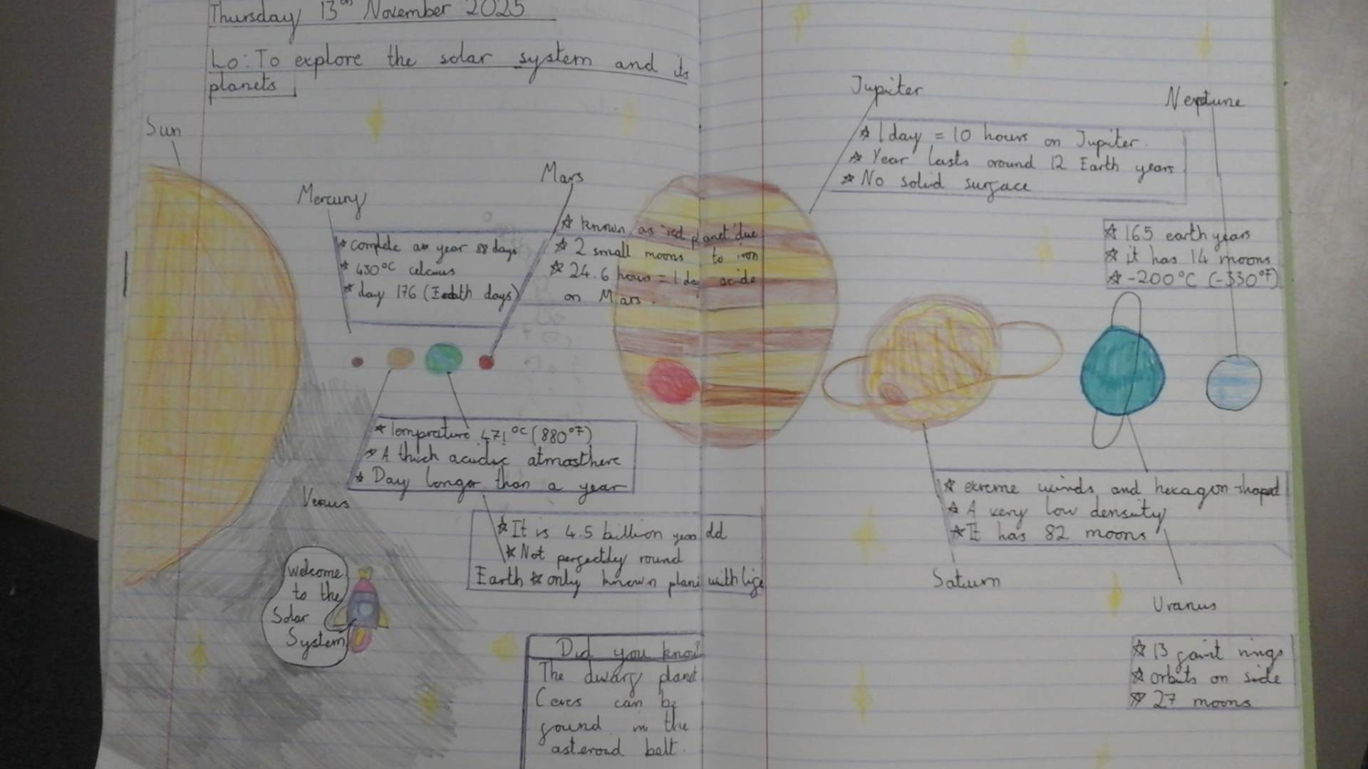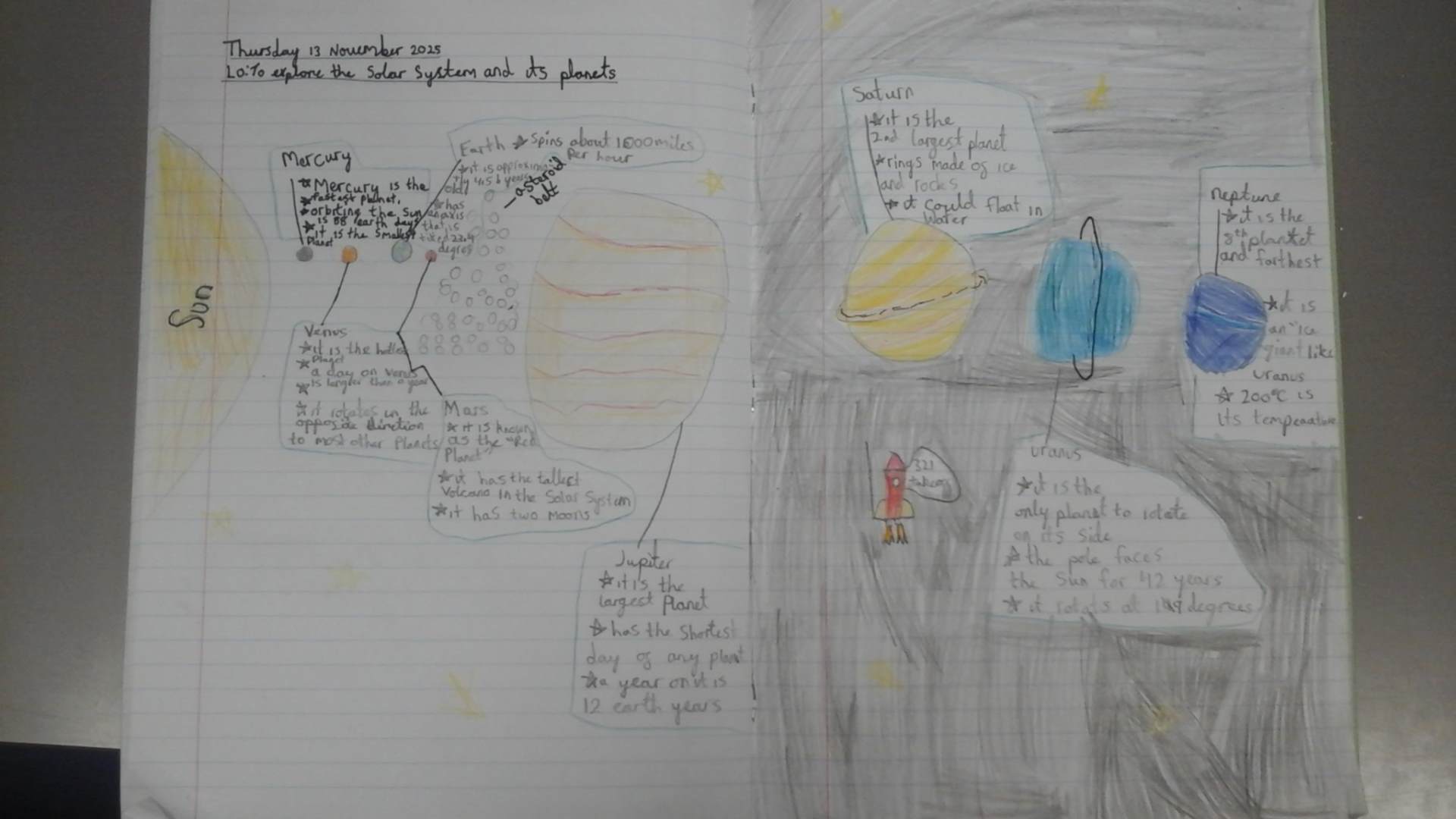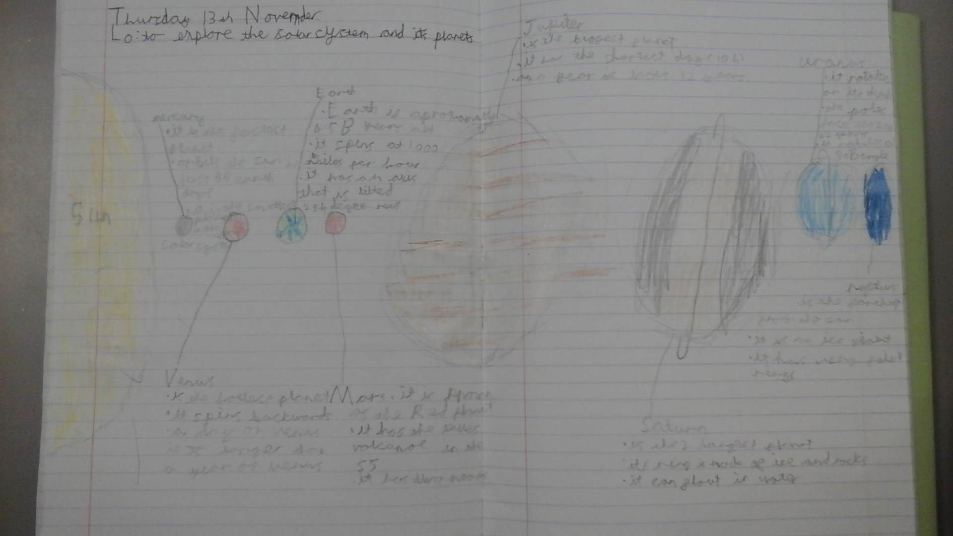 In Science this week, we began our new unit 'Space'. The children began by sharing some of the interesting facts they already knew. After that, we drew the planets in our book to show the order of the planets. Finally, we used the Chromebooks to research interesting facts about the 8 planets in our solar system.