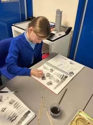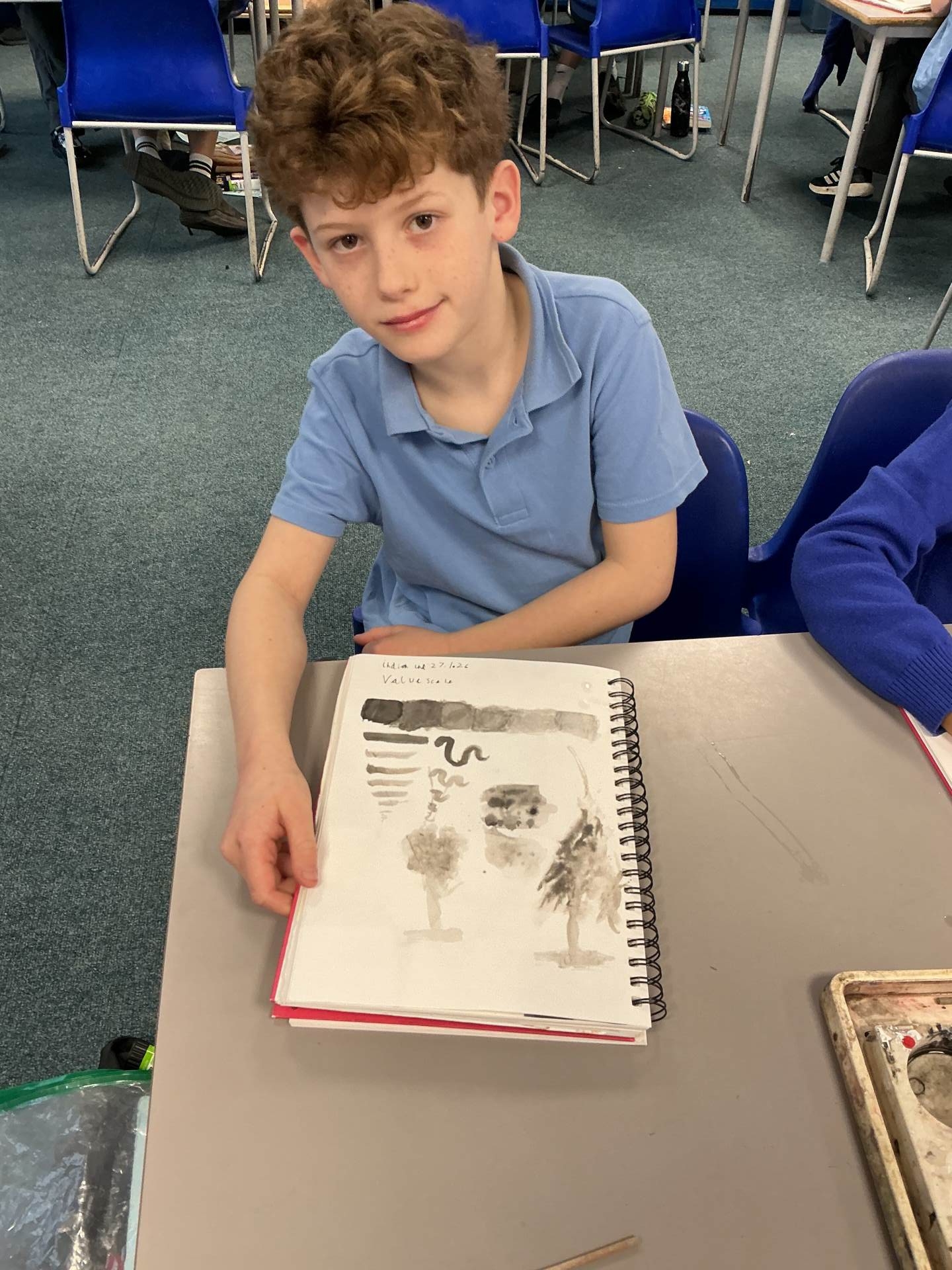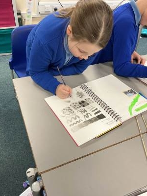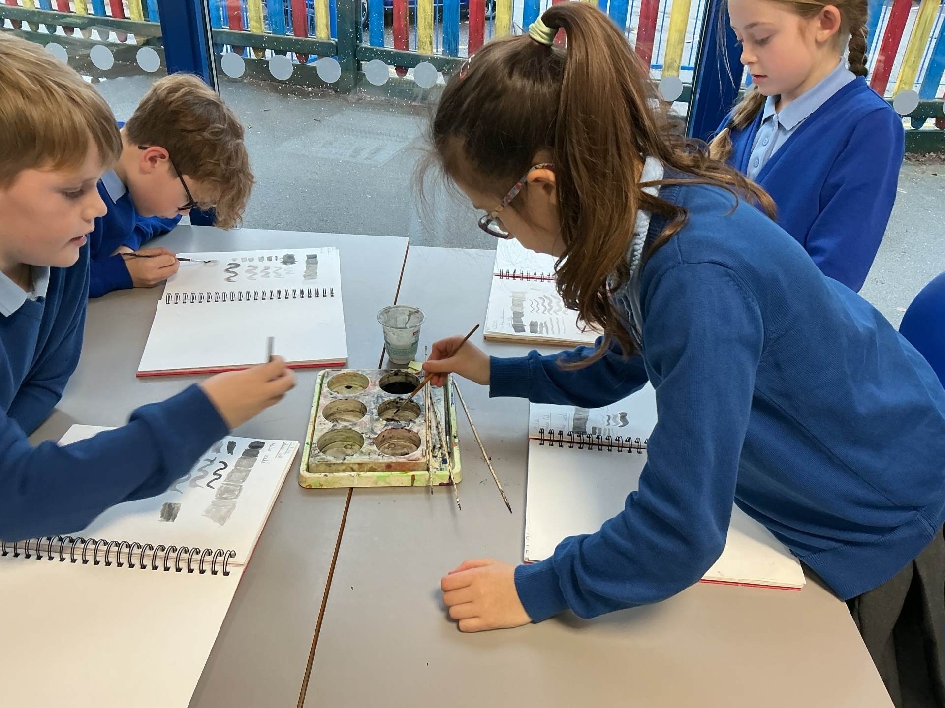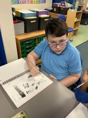 During our Art lesson this week, we learnt a range of techniques that can be created when working with Indian ink. Using a paintbrush and a wooden skewer, we were able to create colour values (shades of colour after adding varying amounts of water to the ink), colour washes (where the ink bled into the water wash) and differing line widths and patterns.