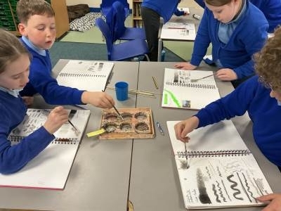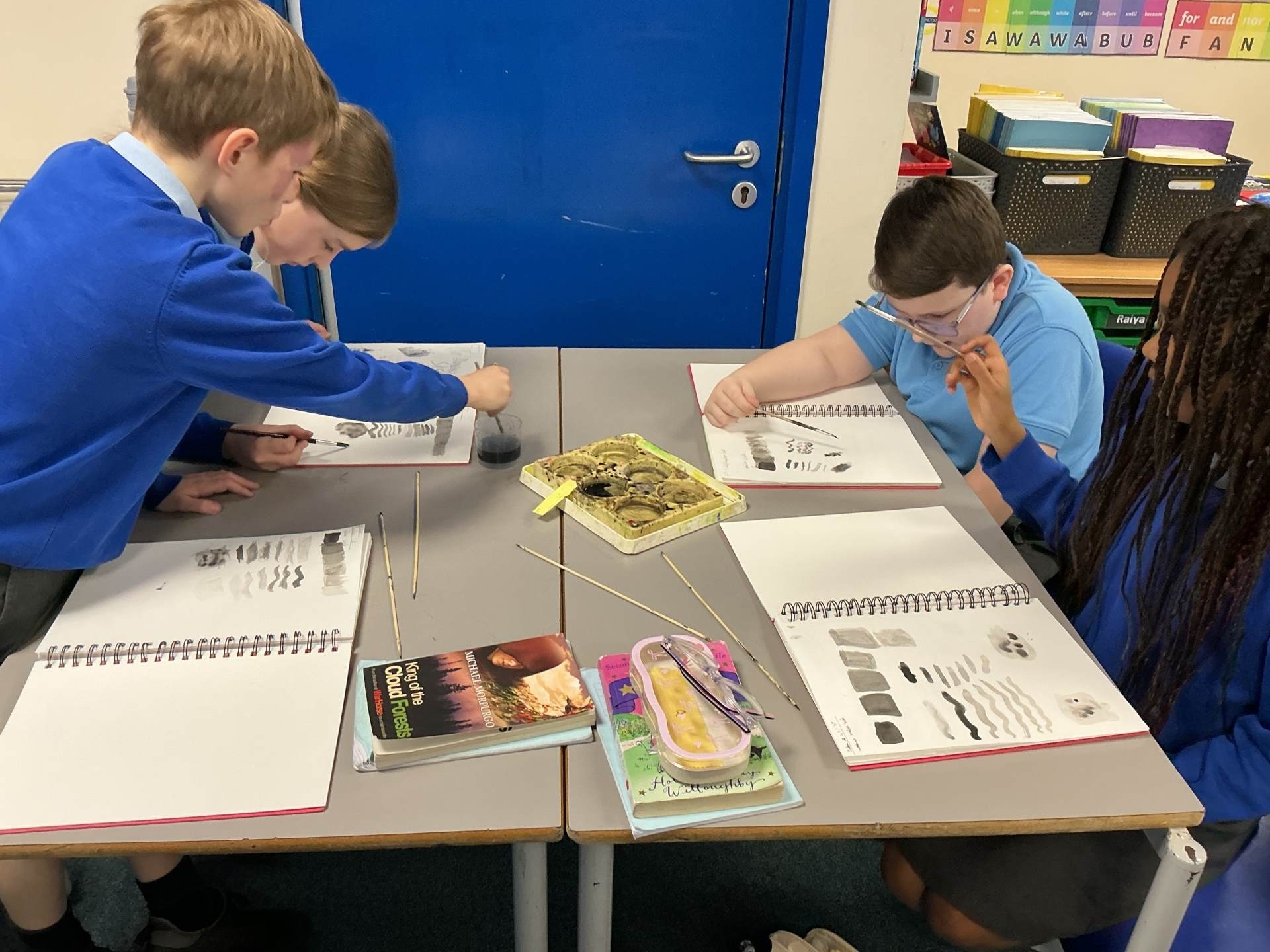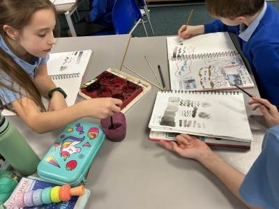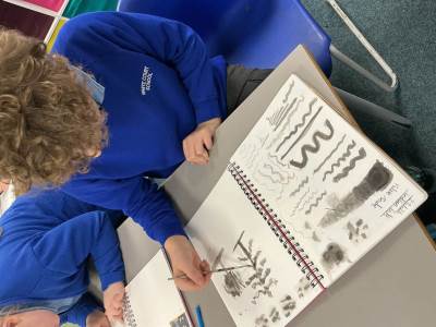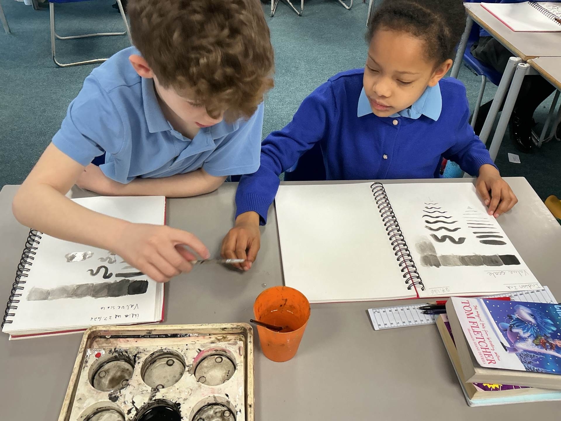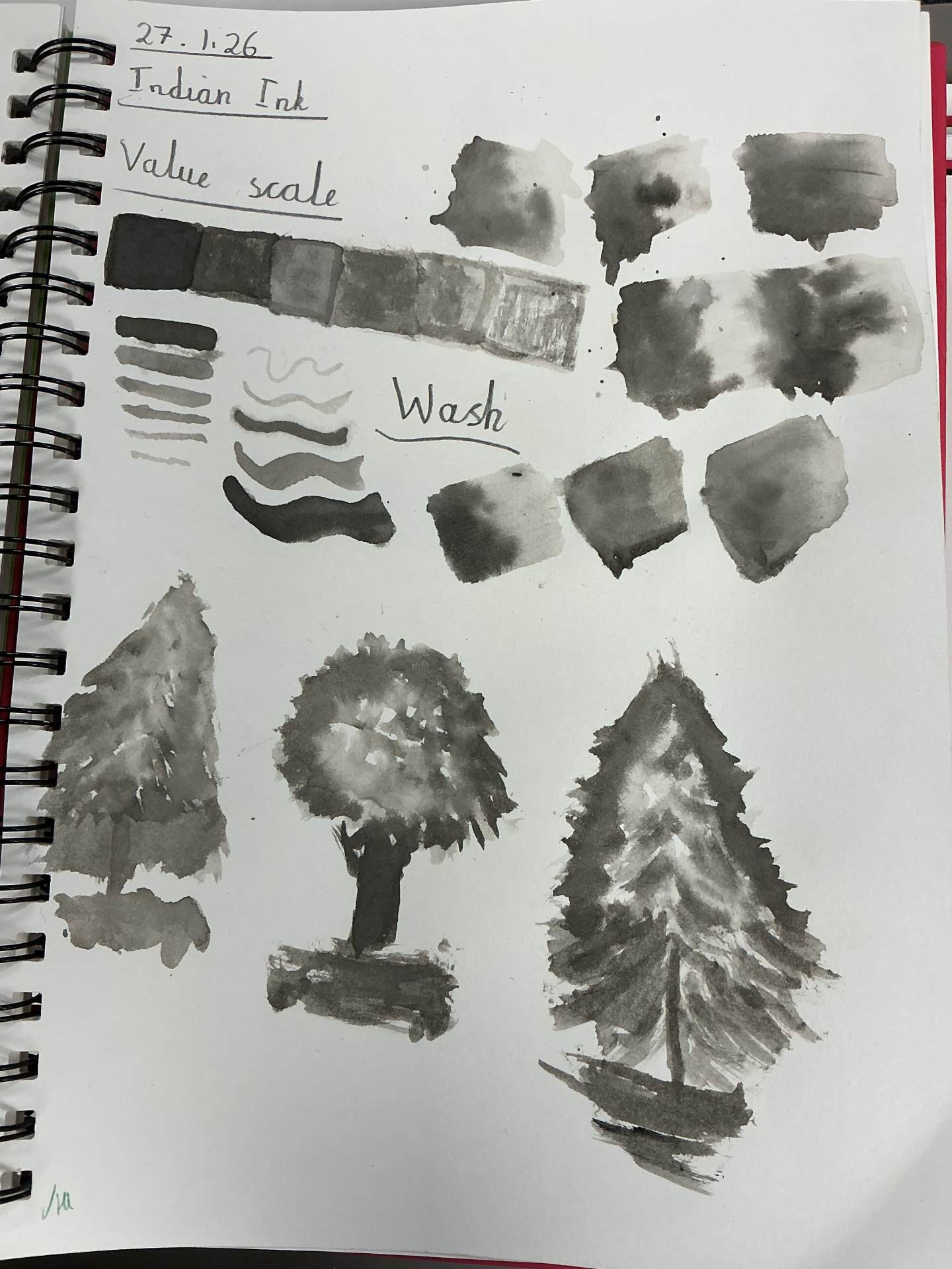 During our Art lesson this week, we learnt a range of techniques that can be created when working with Indian ink. Using a paintbrush and a wooden skewer, we were able to create colour values (shades of colour after adding varying amounts of water to the ink), colour washes (where the ink bled into the water wash) and differing line widths and patterns.