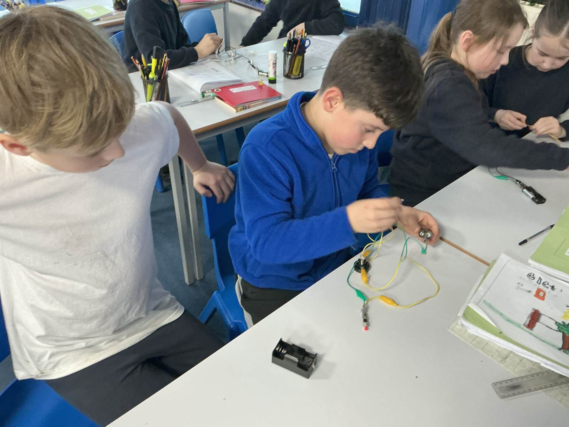 Today, we were excited about creating simple circuits and learning that a circuit is a pathway which electricity flows around and has to be unbroken to work. We learnt that a battery, bulb, switch and wires are all compenents. We added a switch to control the circuit.