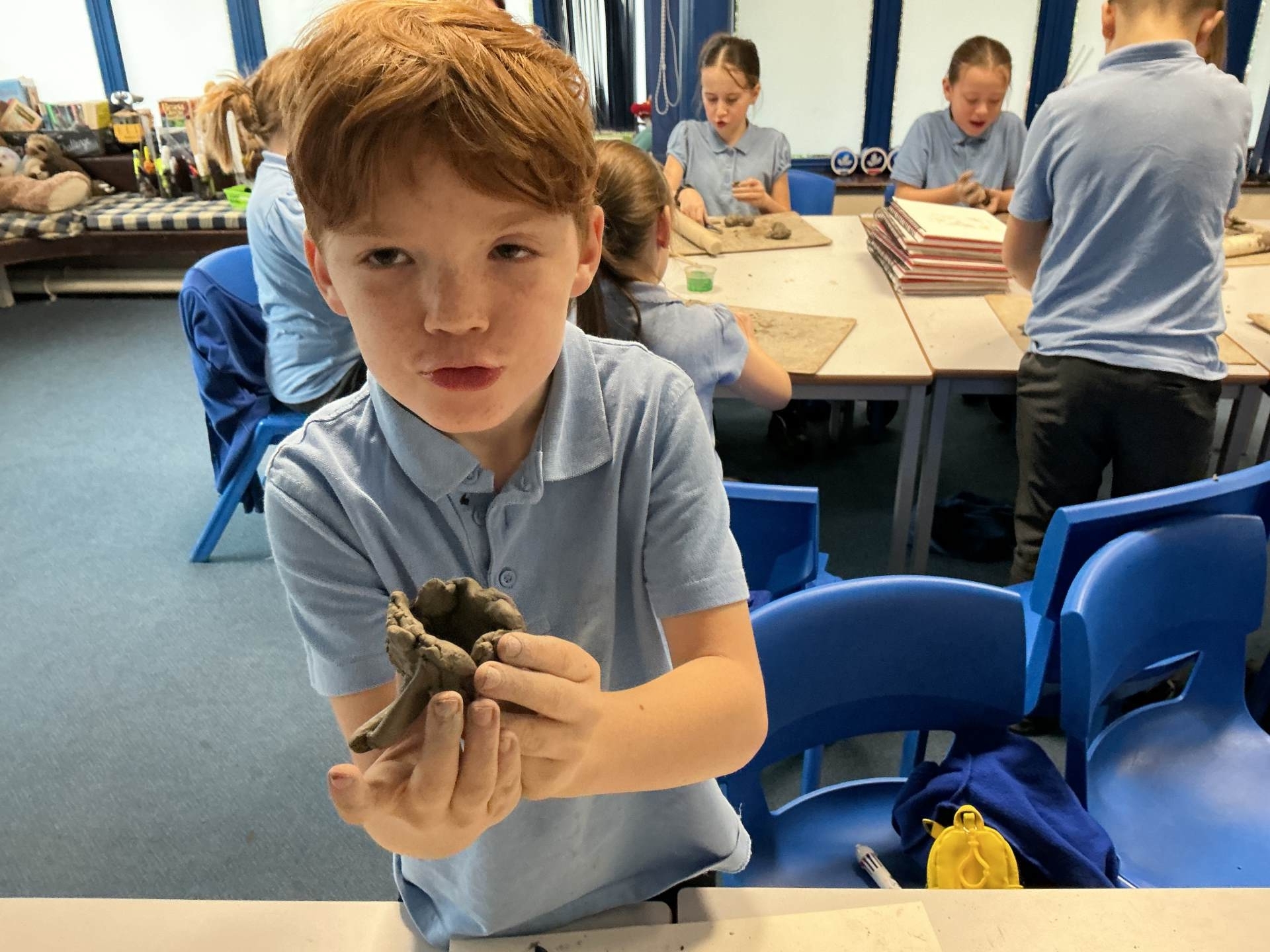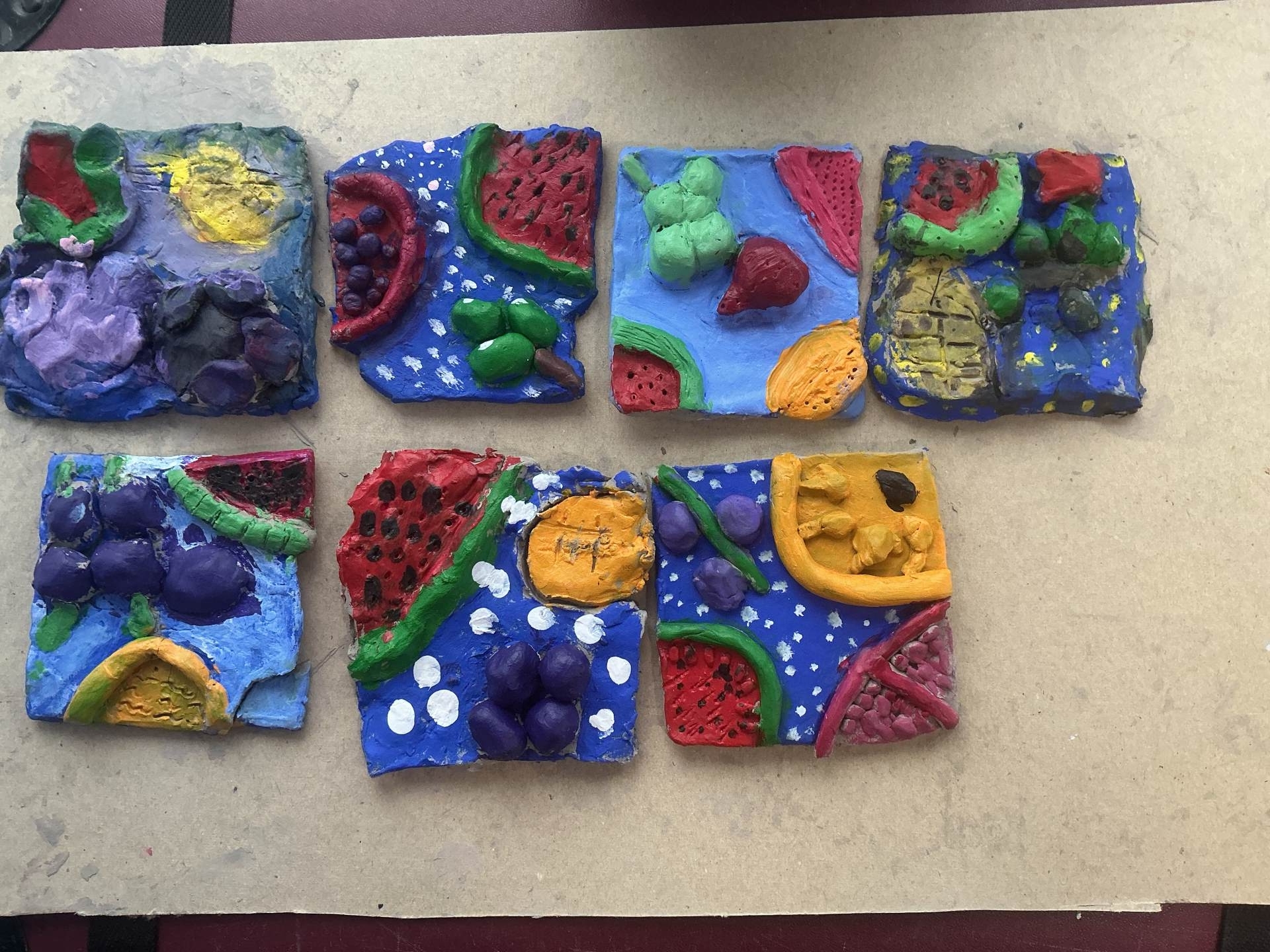 Today, we painted our Still Life Clay Tiles. They have yet to be glazed to create a sleek shine. Not only have we really enjoyed the process of making this art, we have learnt a lot about the use of shape, texture and colour.