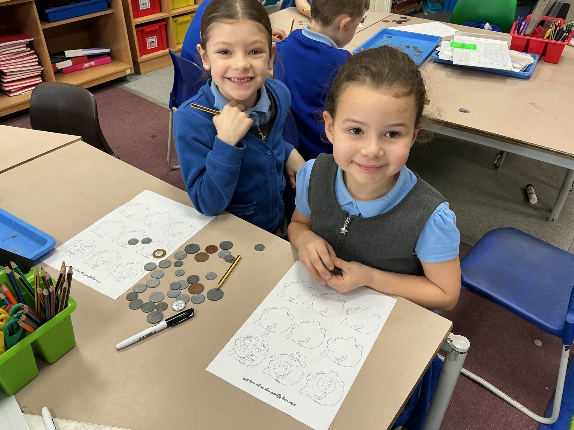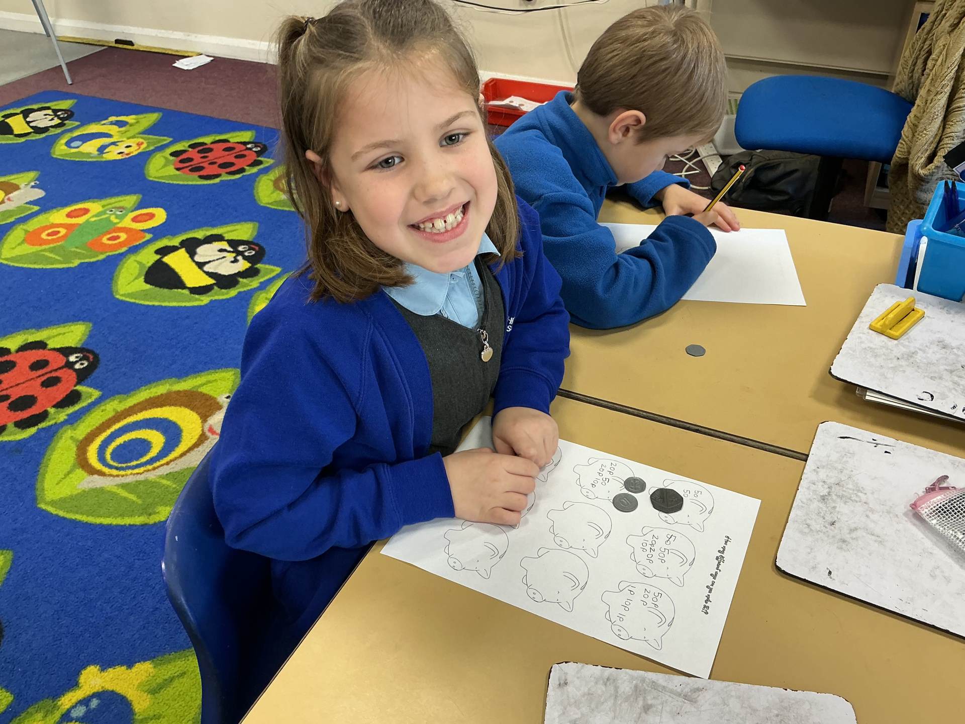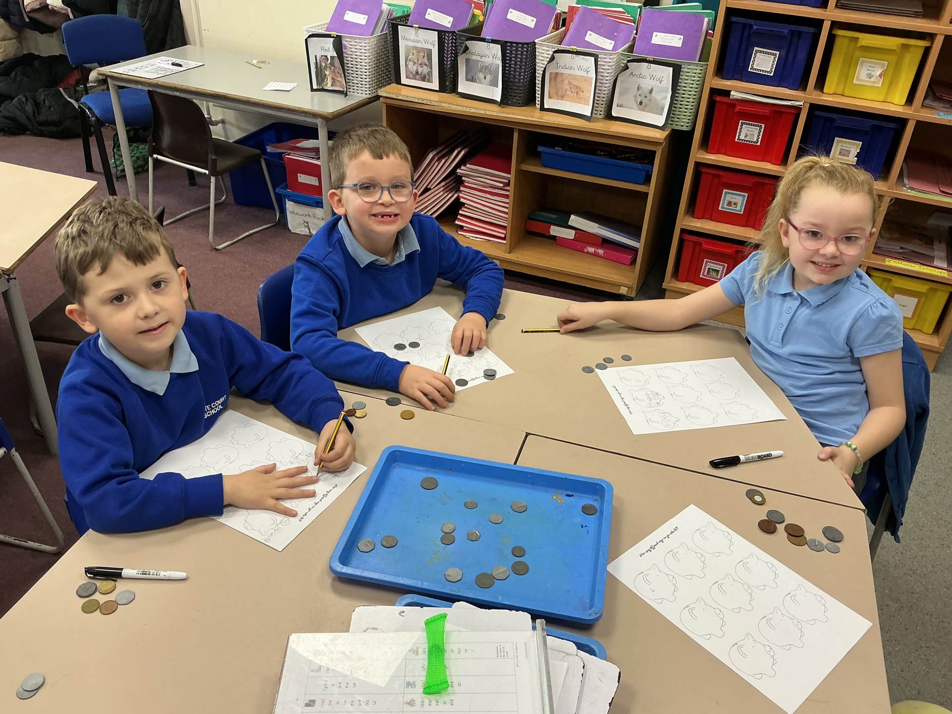 In Maths, we have been learning about money. We practised making ?1 in lots of different ways using coins.