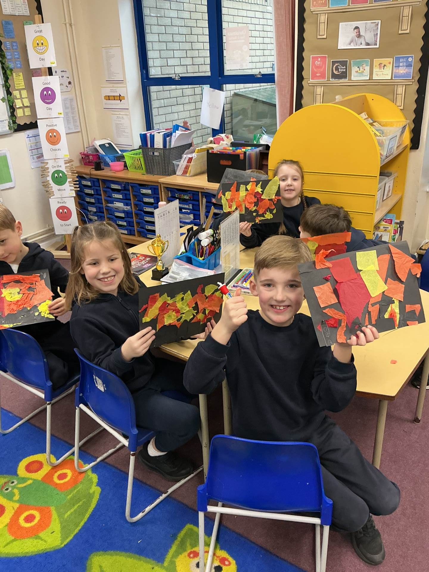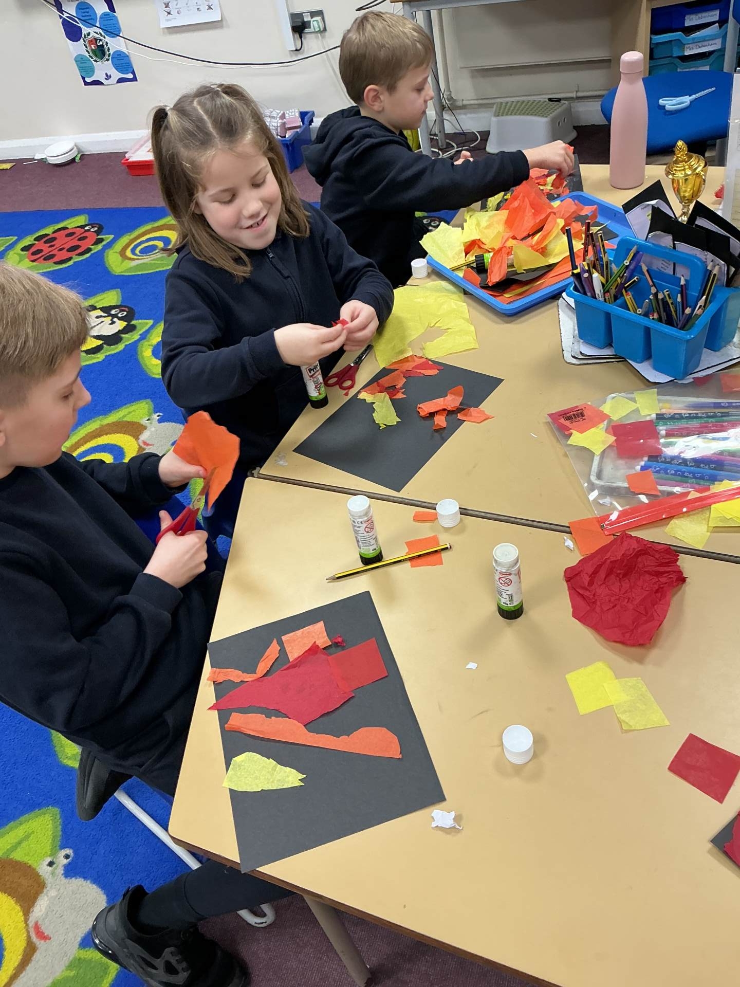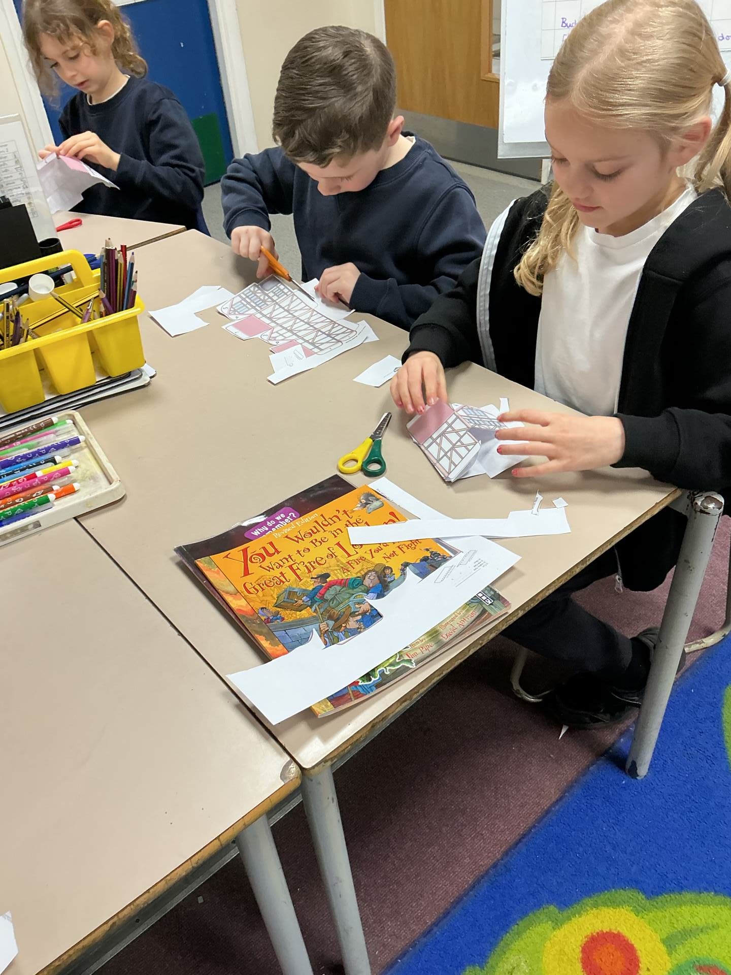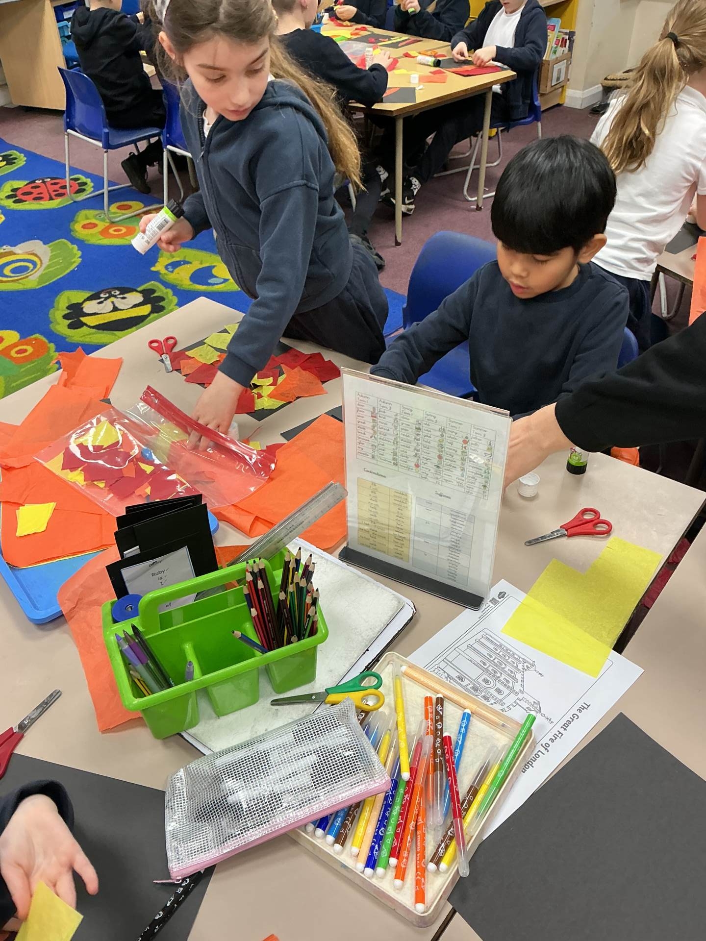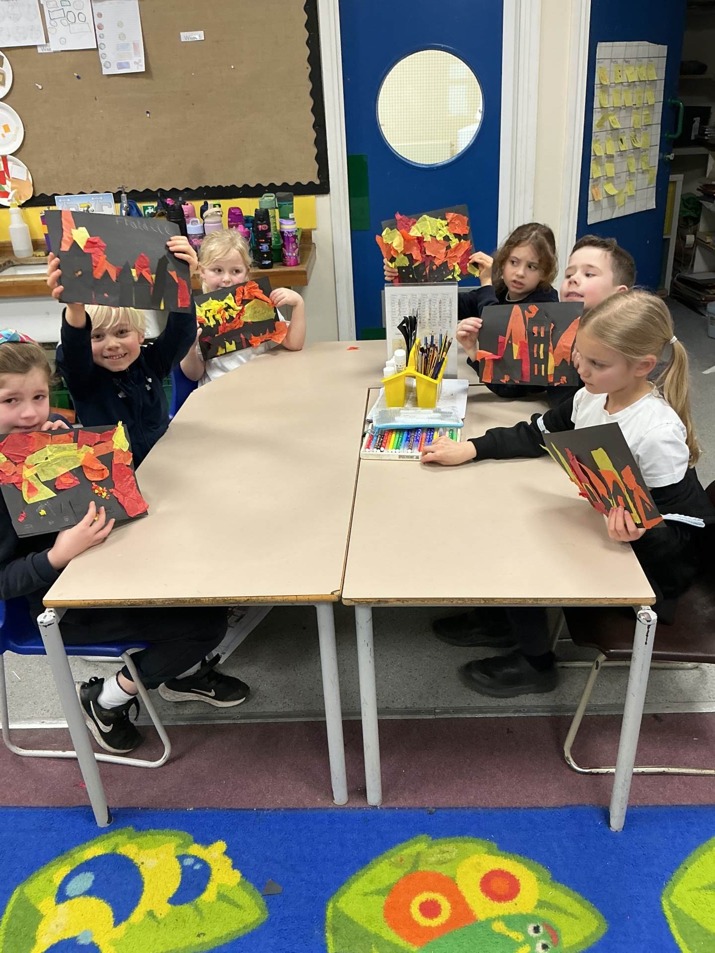Today the children have had a brilliant day learning all about The Great Fire of London. They started off creating a mind map of what they already knew. They then built paper houses ready to burn the next day(as it was too rainy today). After break they made collage pictures depicting the great fire. During the afternoon, they performed a dance learning about how the fire started in Pudding Lane. At the end of the day, the children learnt the song September 1666.
